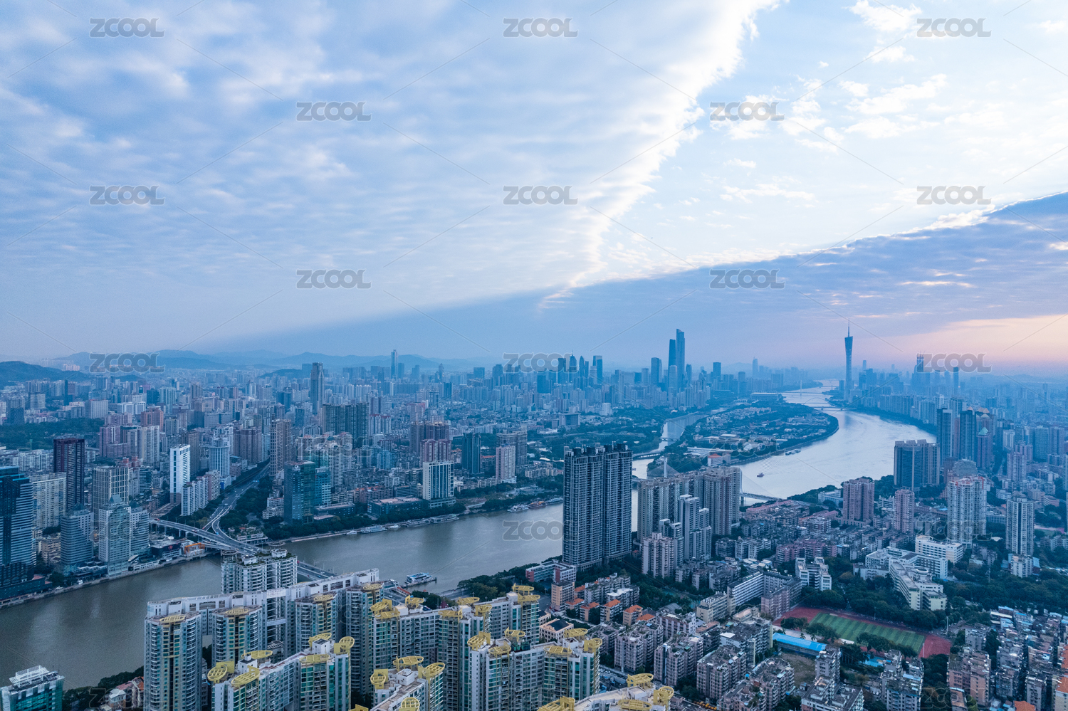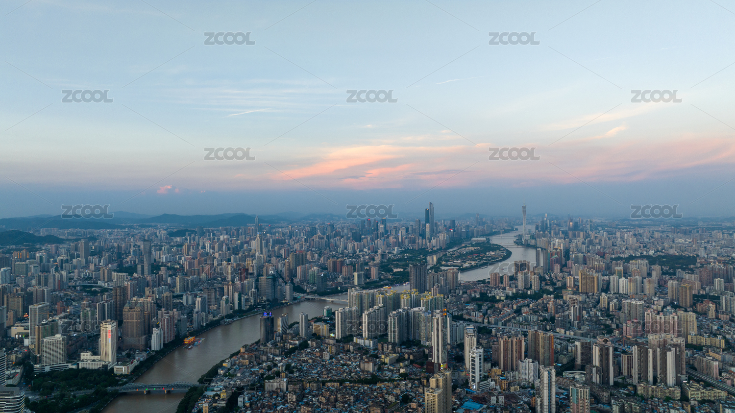 中国广东广州珠江两岸城市黄昏天际线航拍风光