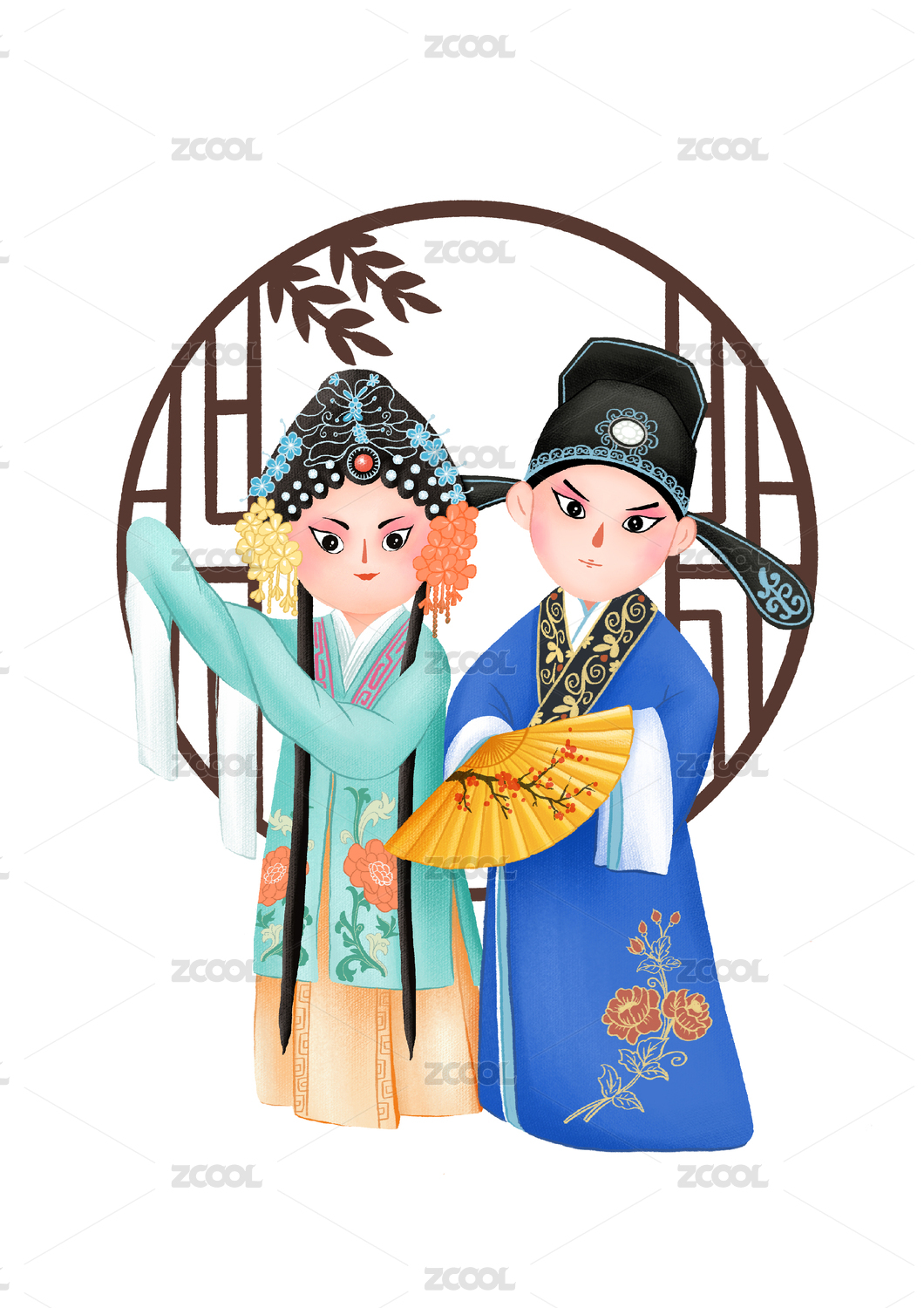 带花窗背景的中国风可爱戏剧人物花旦和小生