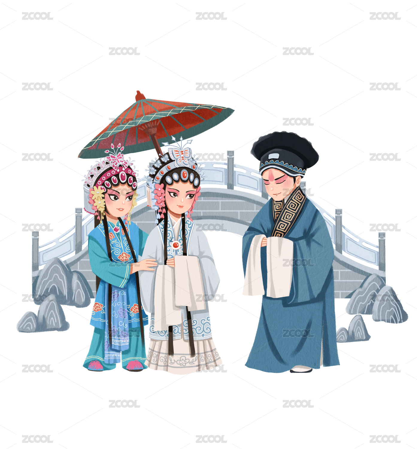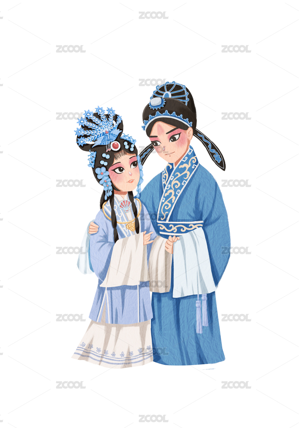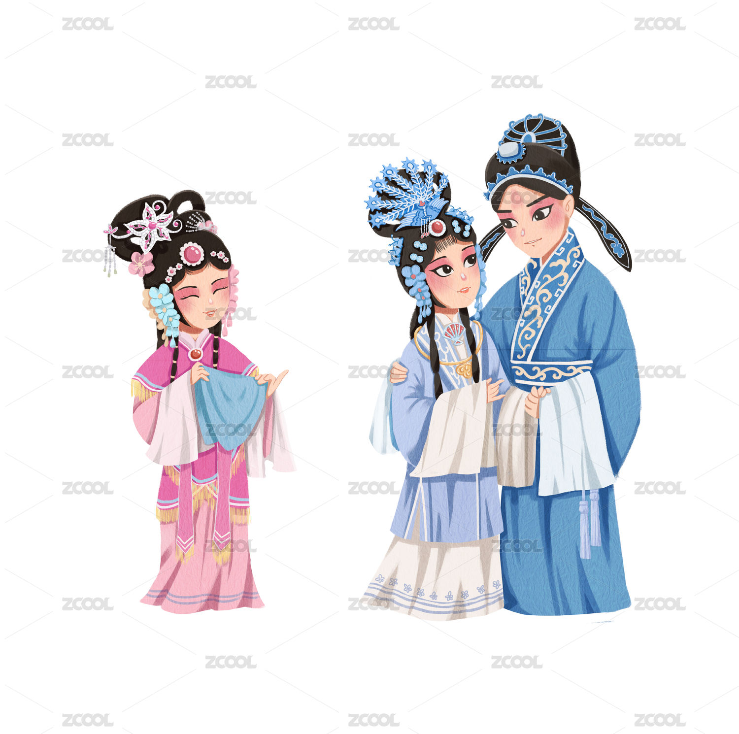 无背景的中国风可爱戏曲人物花旦和小生