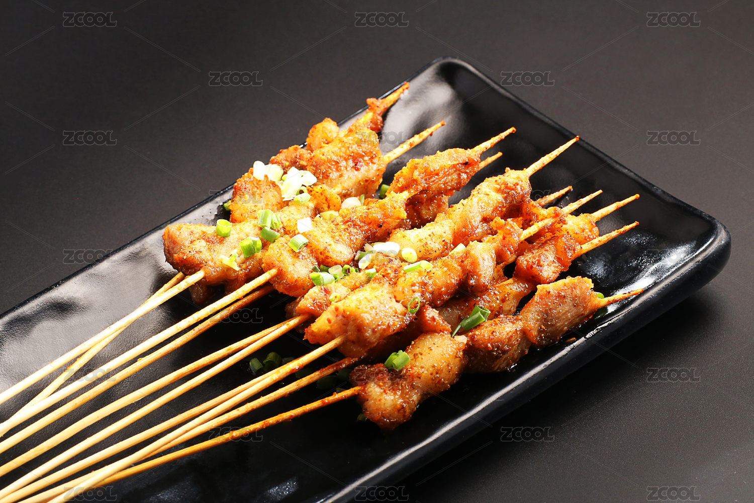 黑色盘子中的烤羊肉串