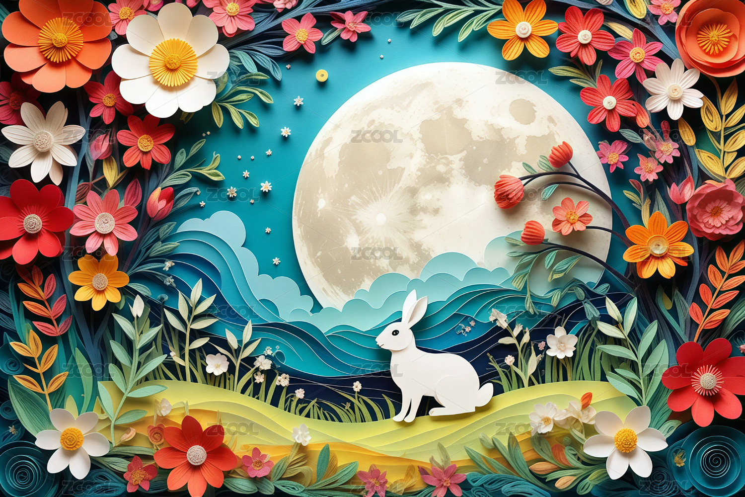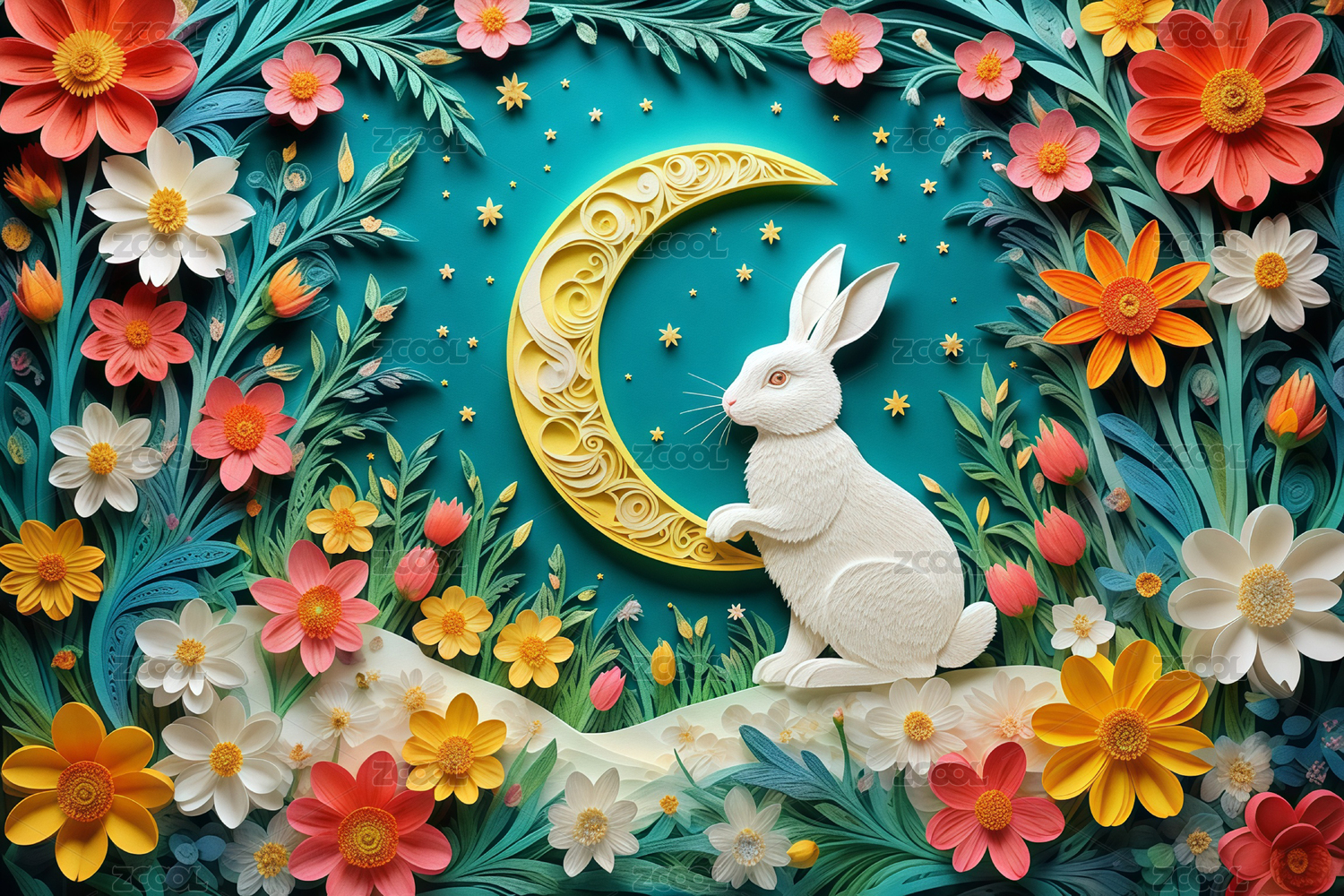 多维剪纸工艺月亮兔子与花草艺术纸质插画