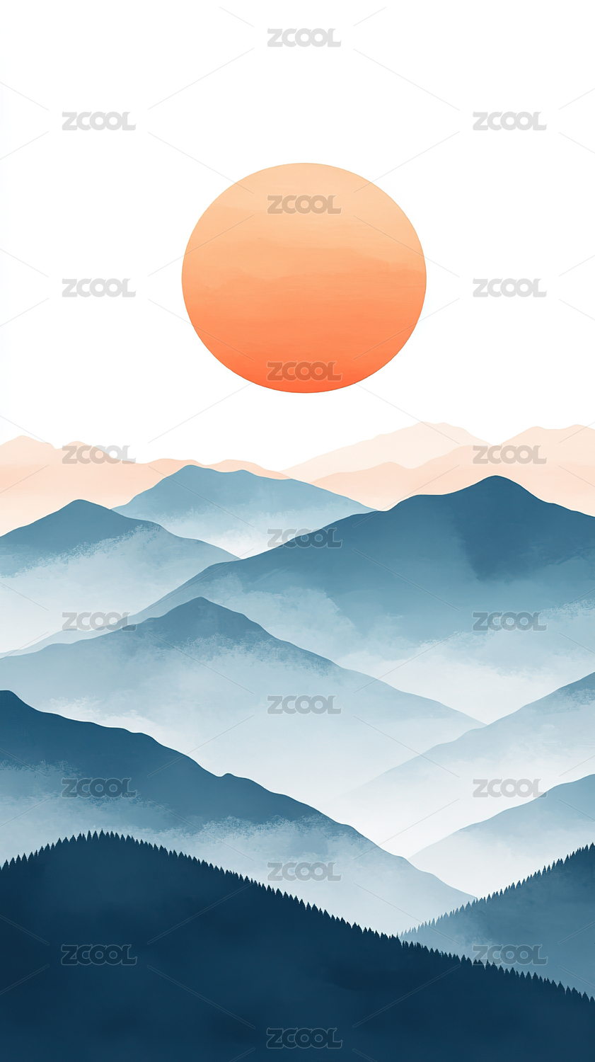 极简,简约,风景,山水,太阳,月亮,云朵,山峦,山峰,蓝色