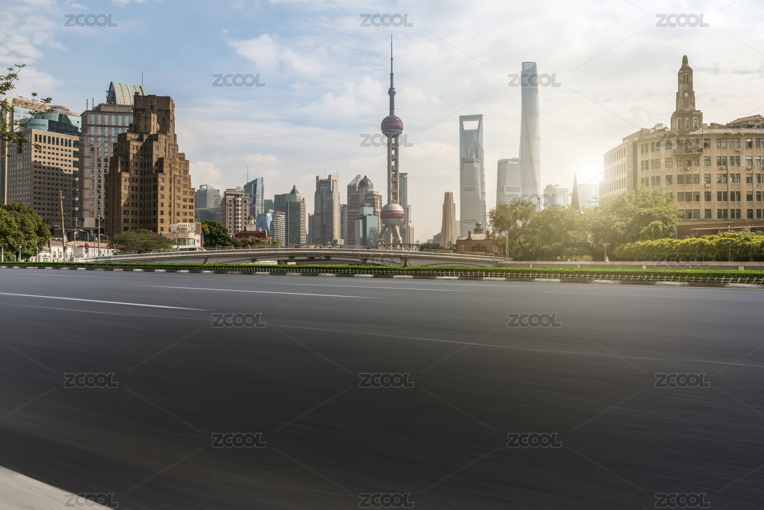 沥青高速公路天际线和上海陆家嘴现代建筑