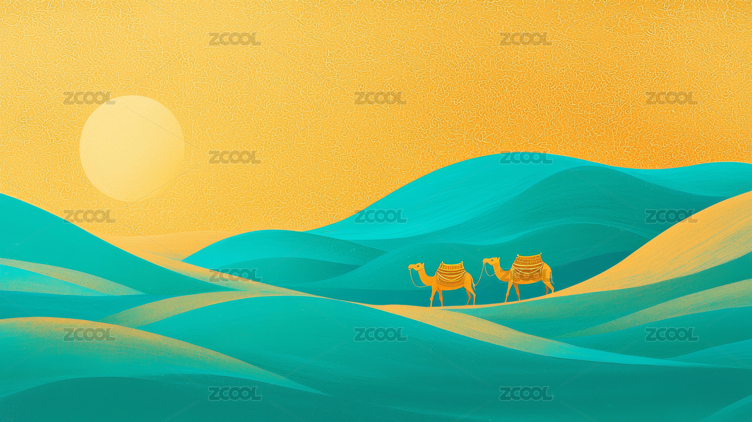 金色沙漠,青绿色山丘和骆驼队,丝绸之路