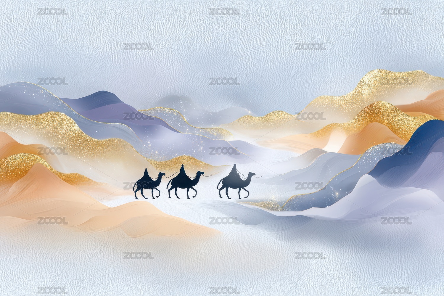 金色沙漠和行走的骆驼队,丝绸之路插画
