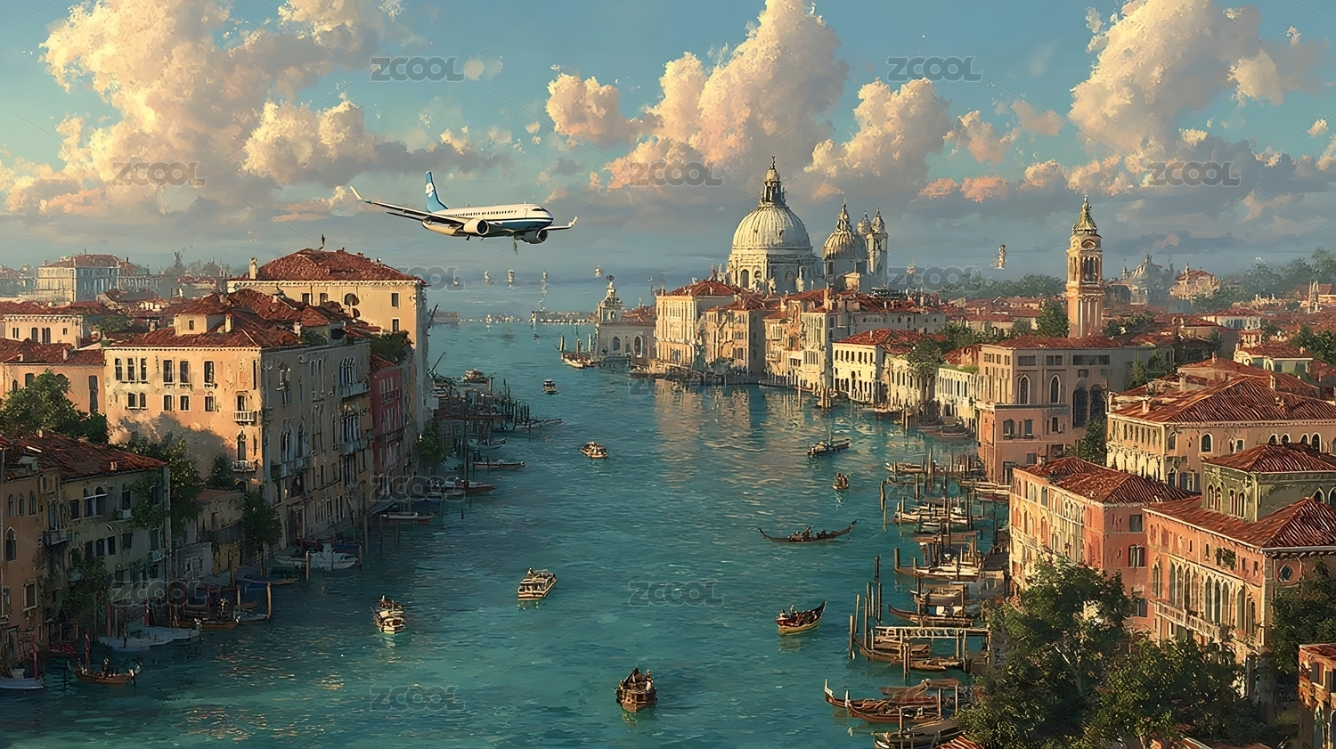 梦幻夜晚有河流穿过的欧式古典城市建筑油画