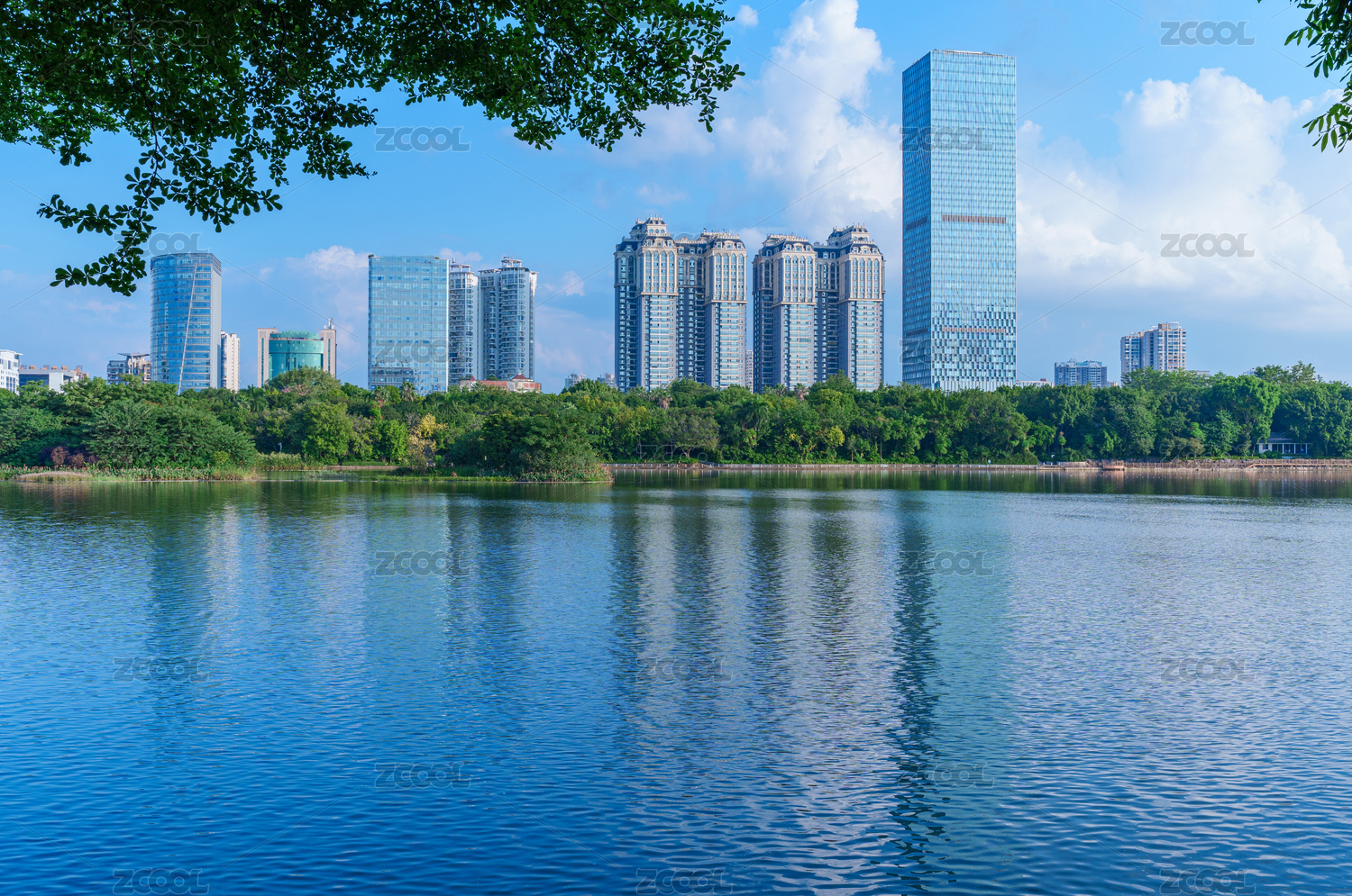 南宁南湖公园蓝天白云与城市摩天大楼建筑