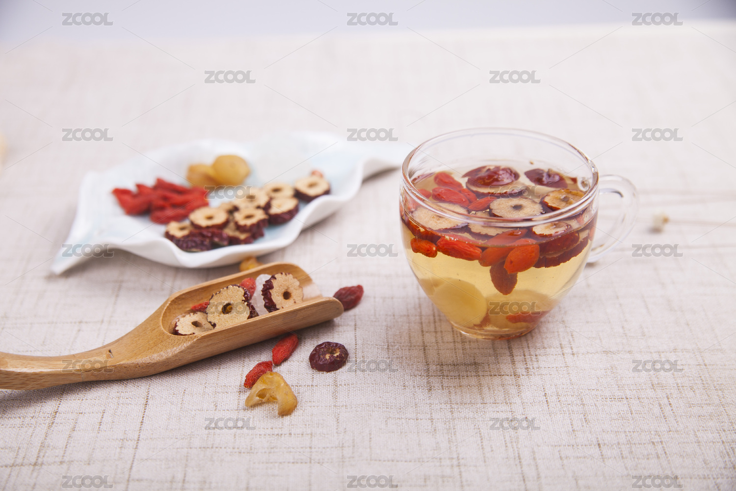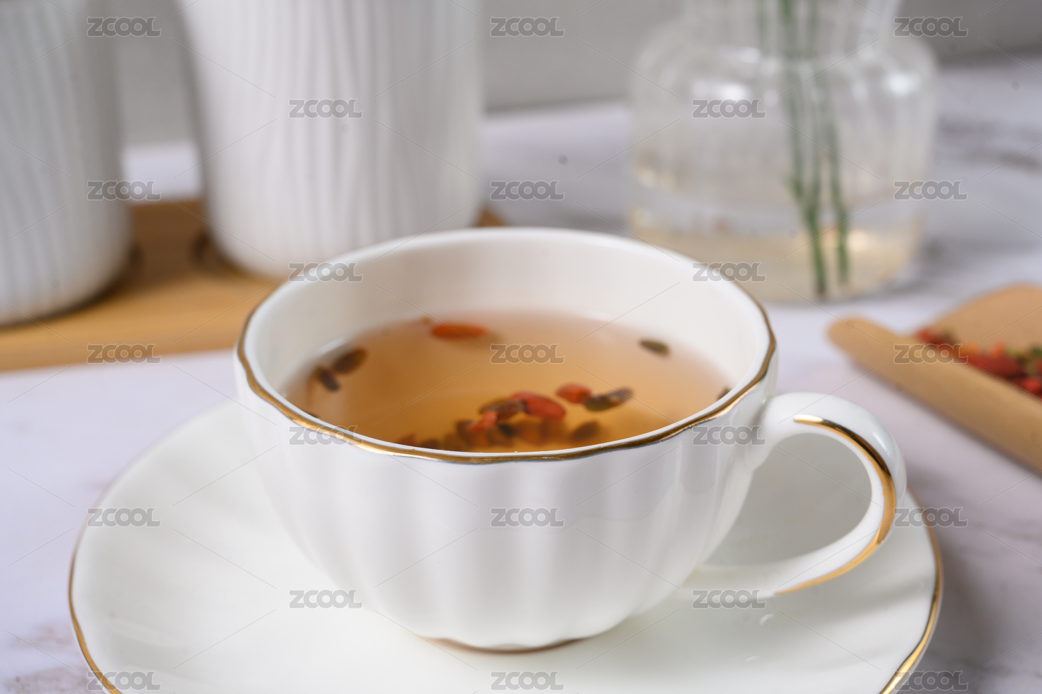 桌面上的杯子里的甘甜可口的山茱萸茶