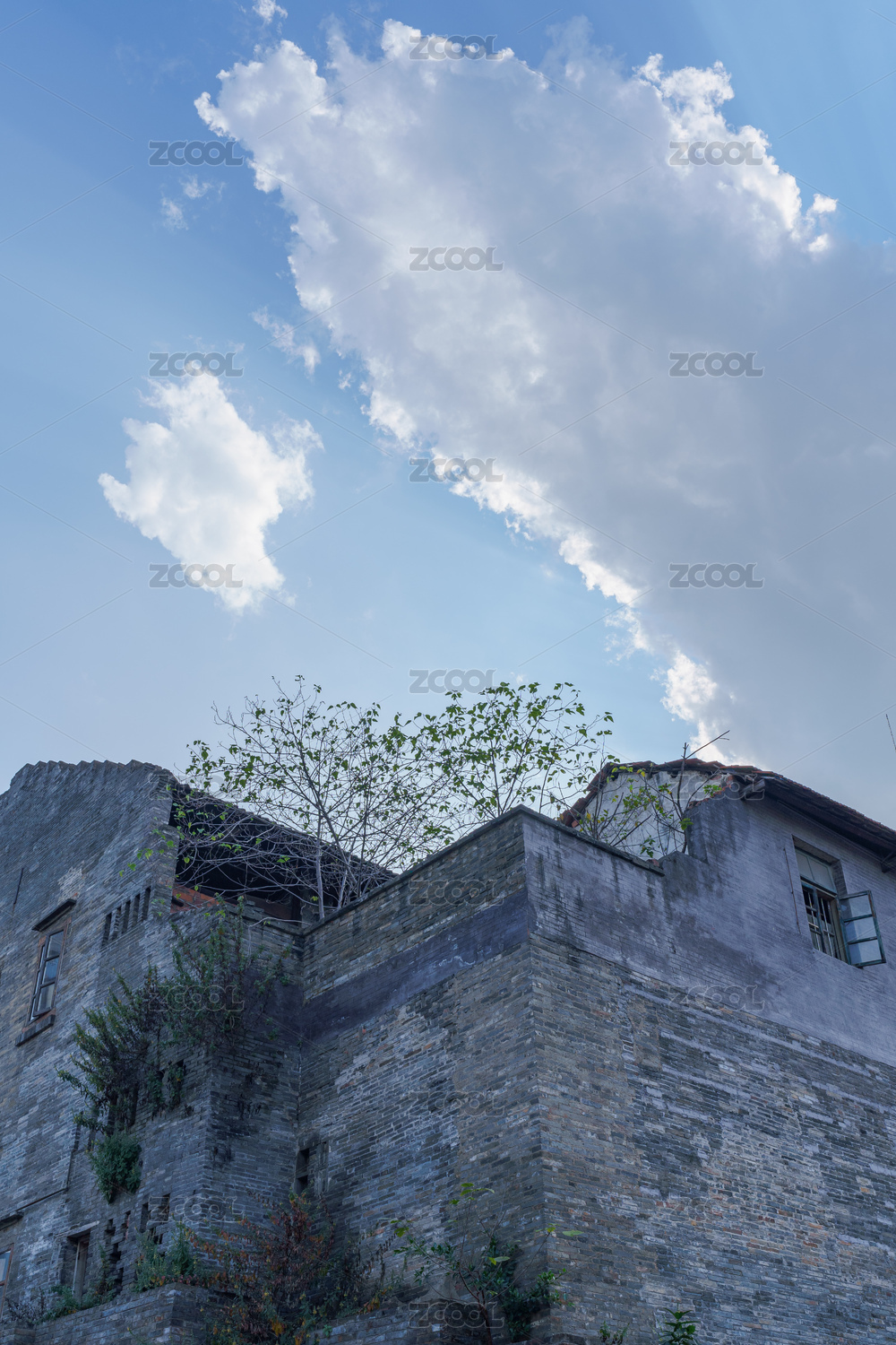 重庆破旧的老房子与枯树蓝天