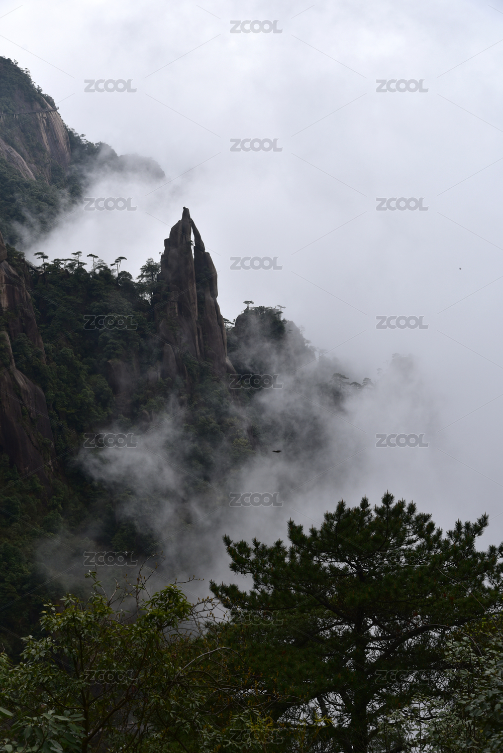 中国江西省三清山上的云雾奇石与松树