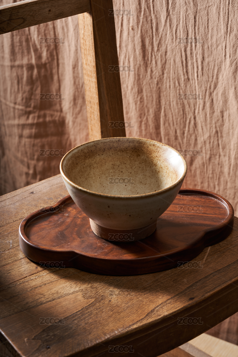 一个木头碗木制餐具摆放在桌面上特写