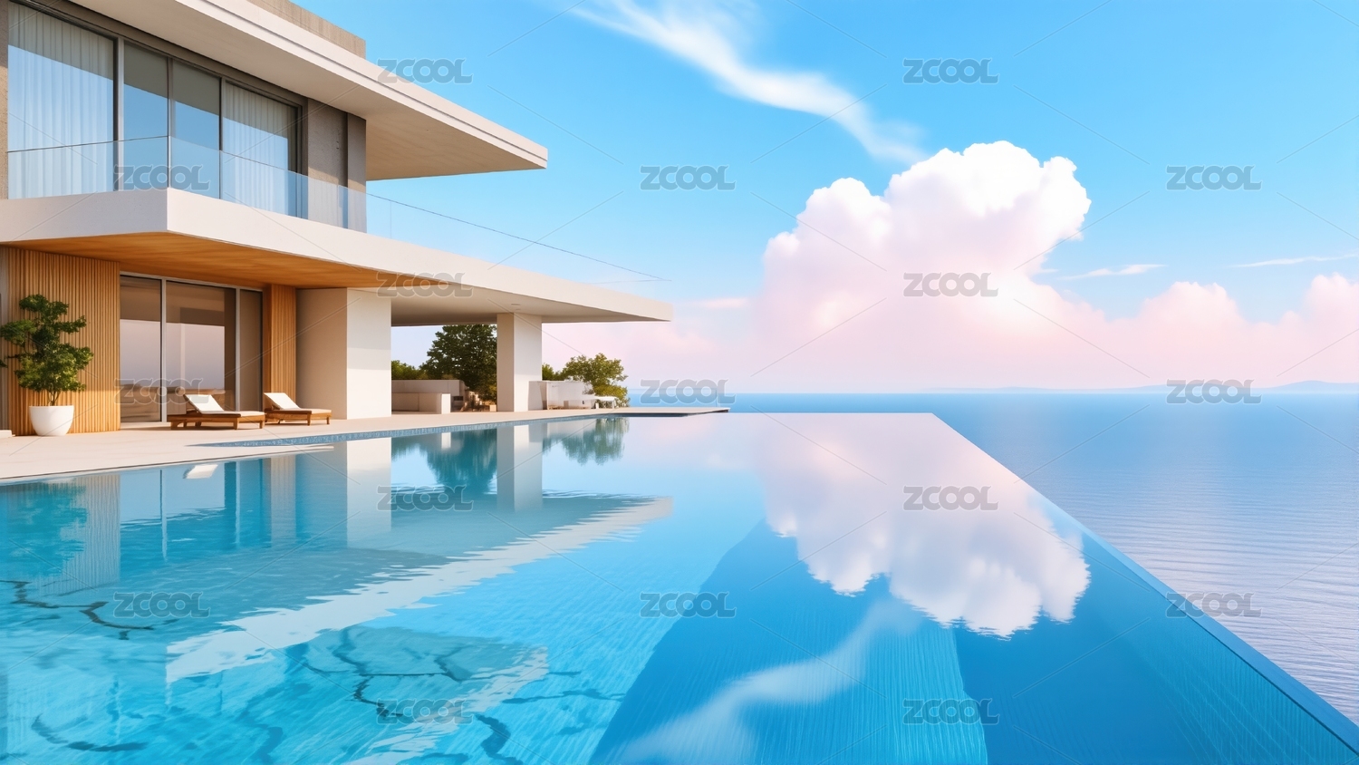 夕阳下的别墅海边现代建筑内部景观无边泳池