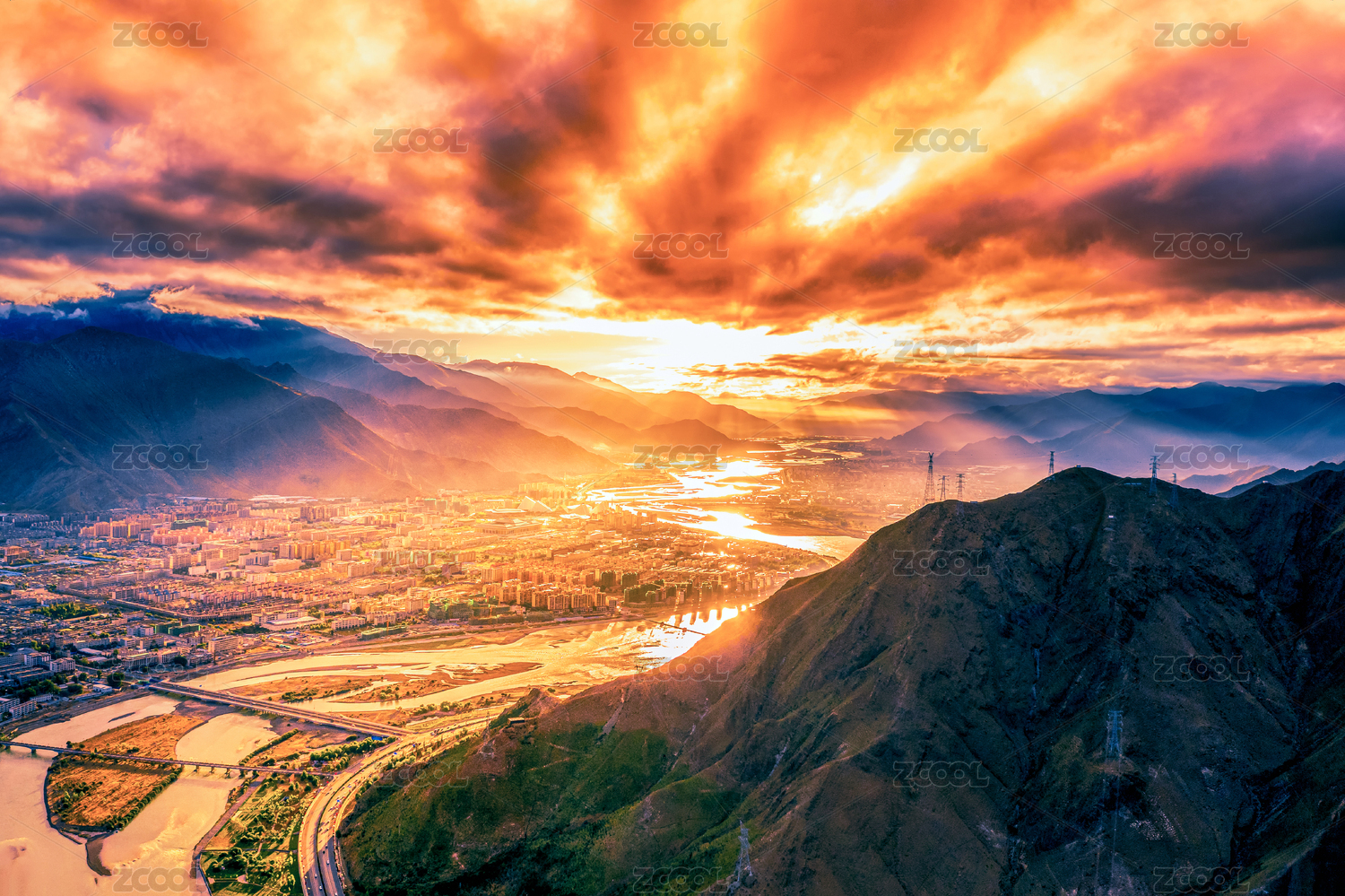 夕阳的余辉投射在山谷间的村镇,中国福建龙岩小池