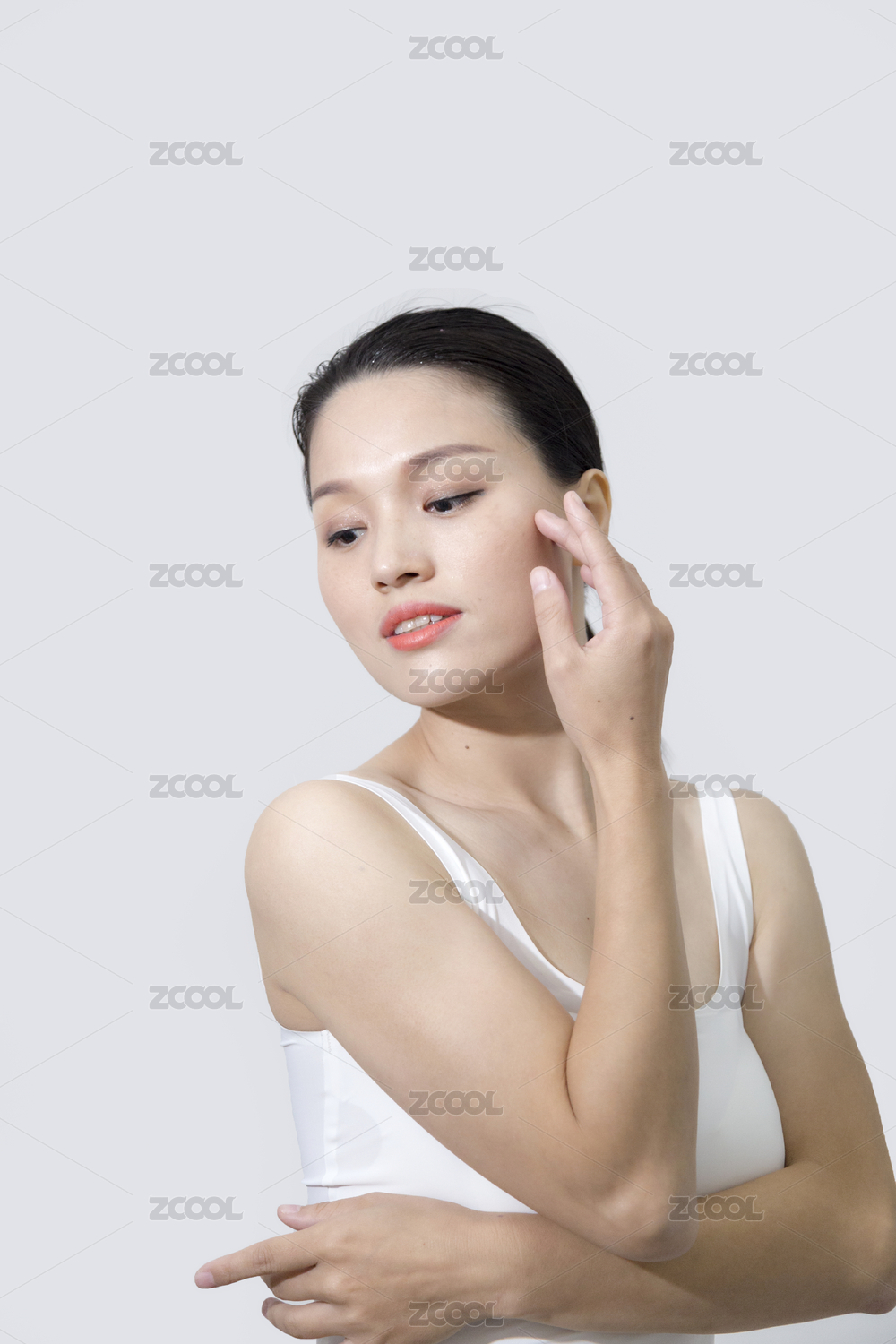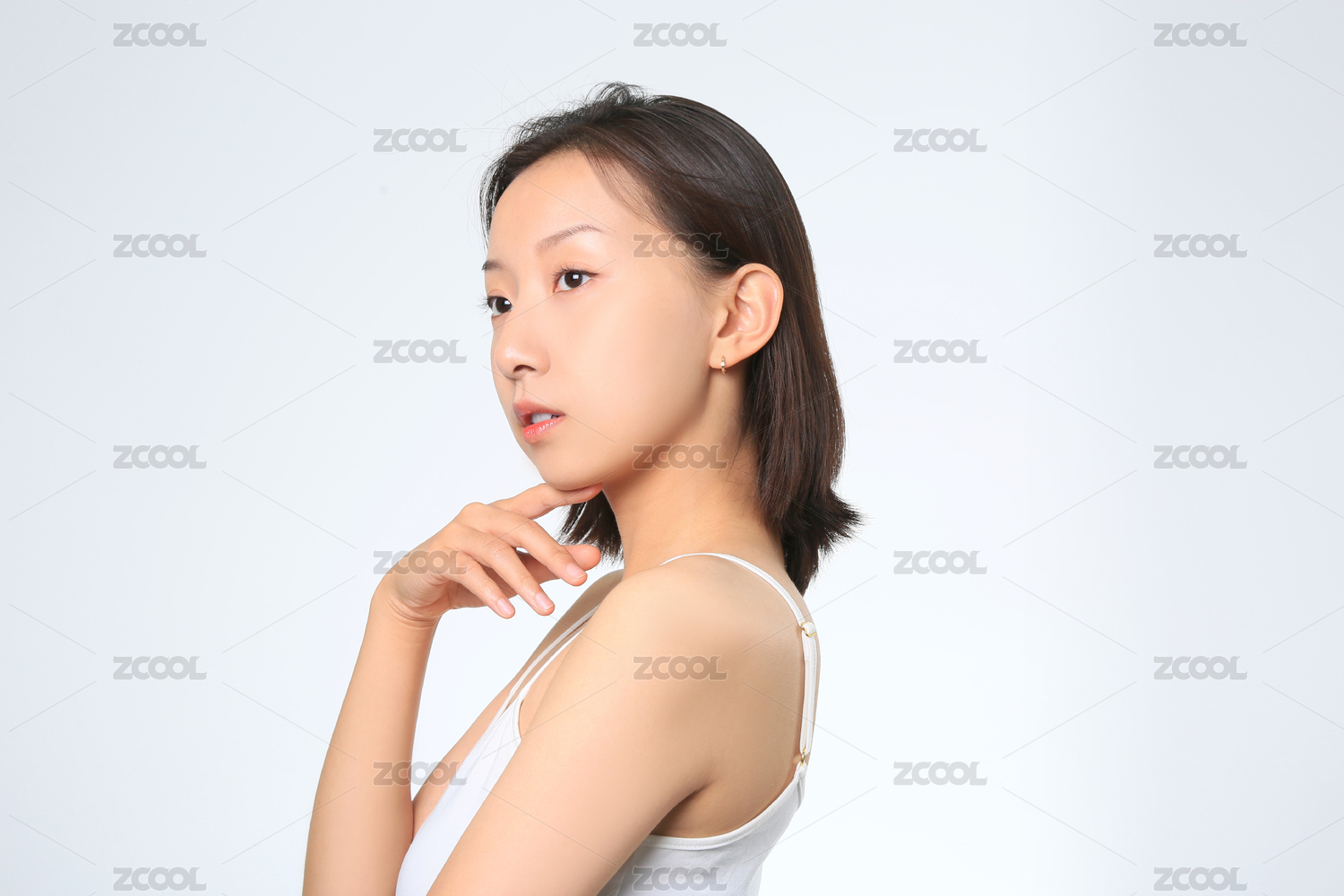 一名化妆的亚裔女孩站在纯色背景前用手指拖着下巴看向别处