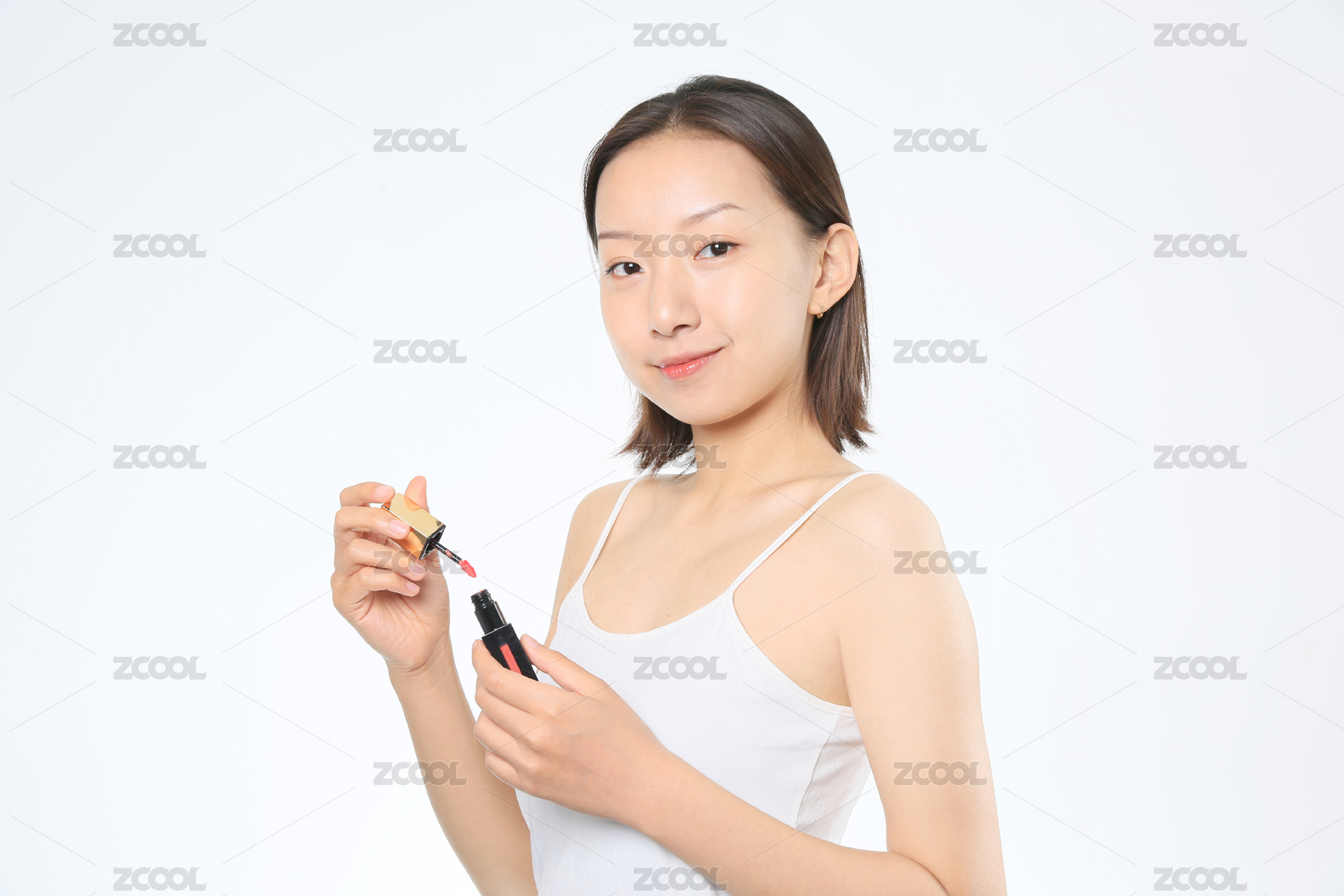 一名化妆的亚裔女孩涂抹唇釉看向镜头