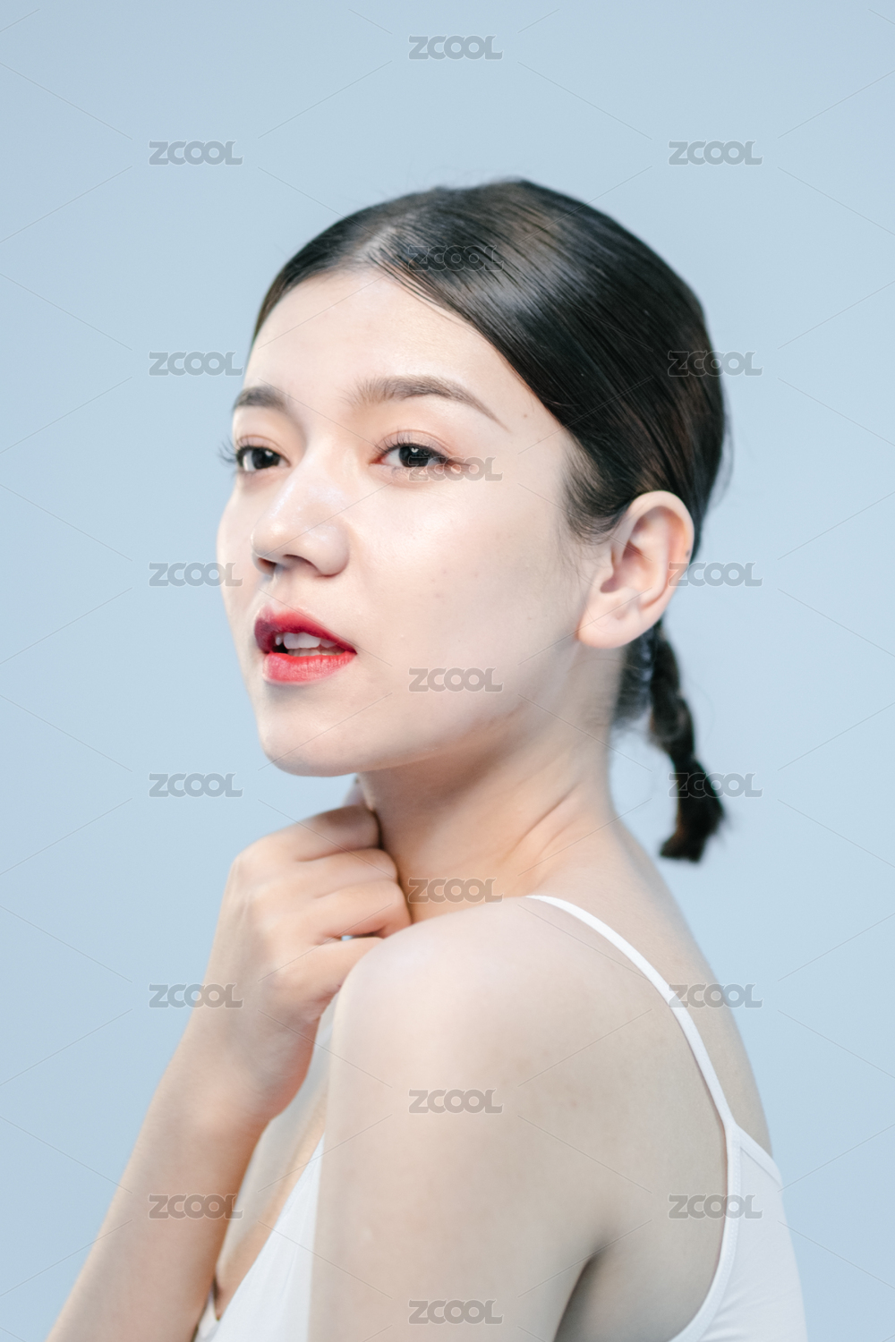 一名化妆的亚裔女孩站在纯色背景一只手放在肩膀上看向镜头