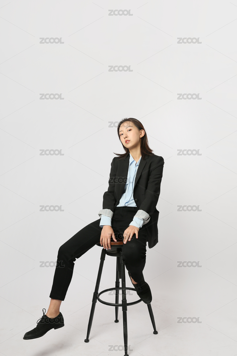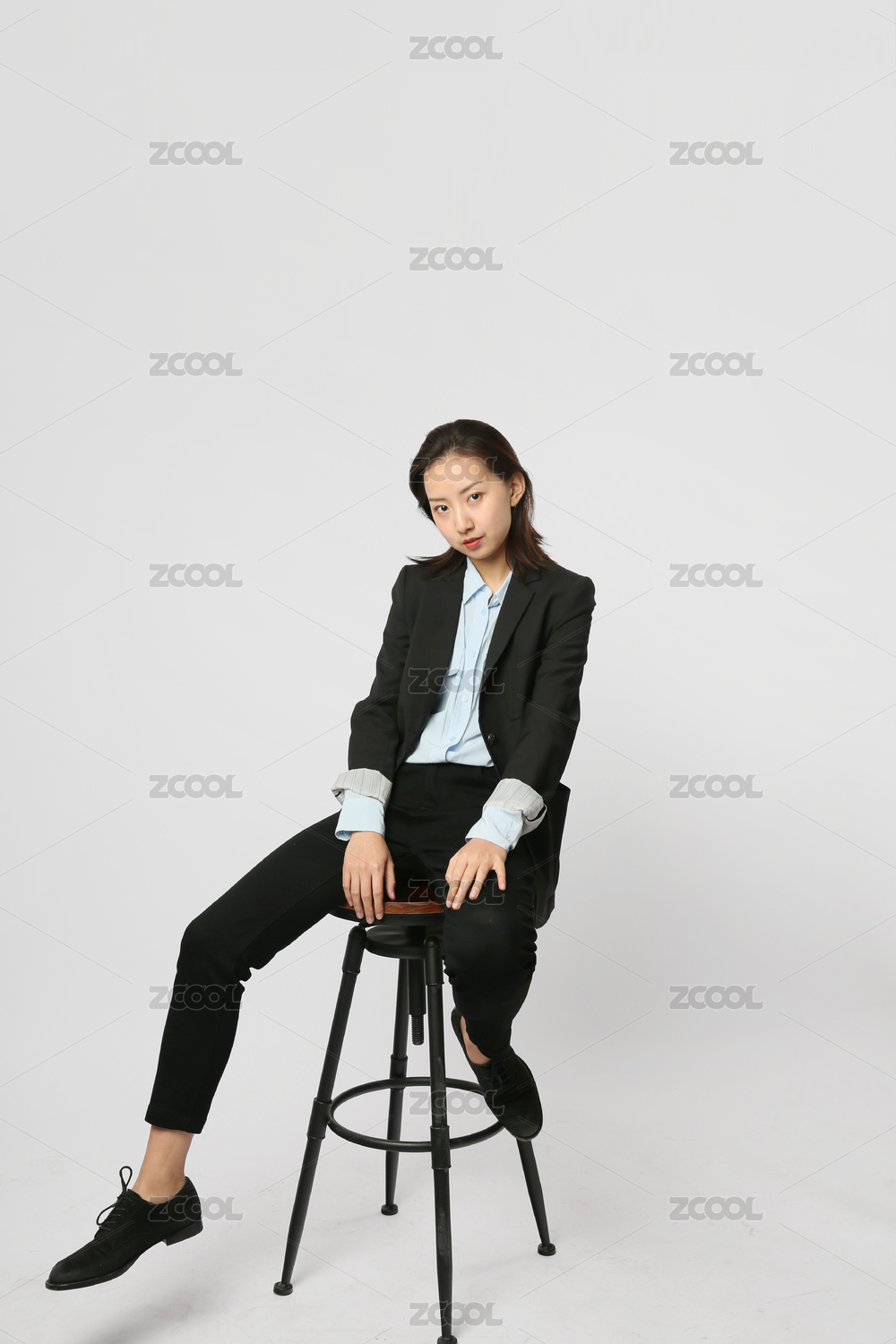 身穿正装的中国女人坐在白色墙前单手插兜看