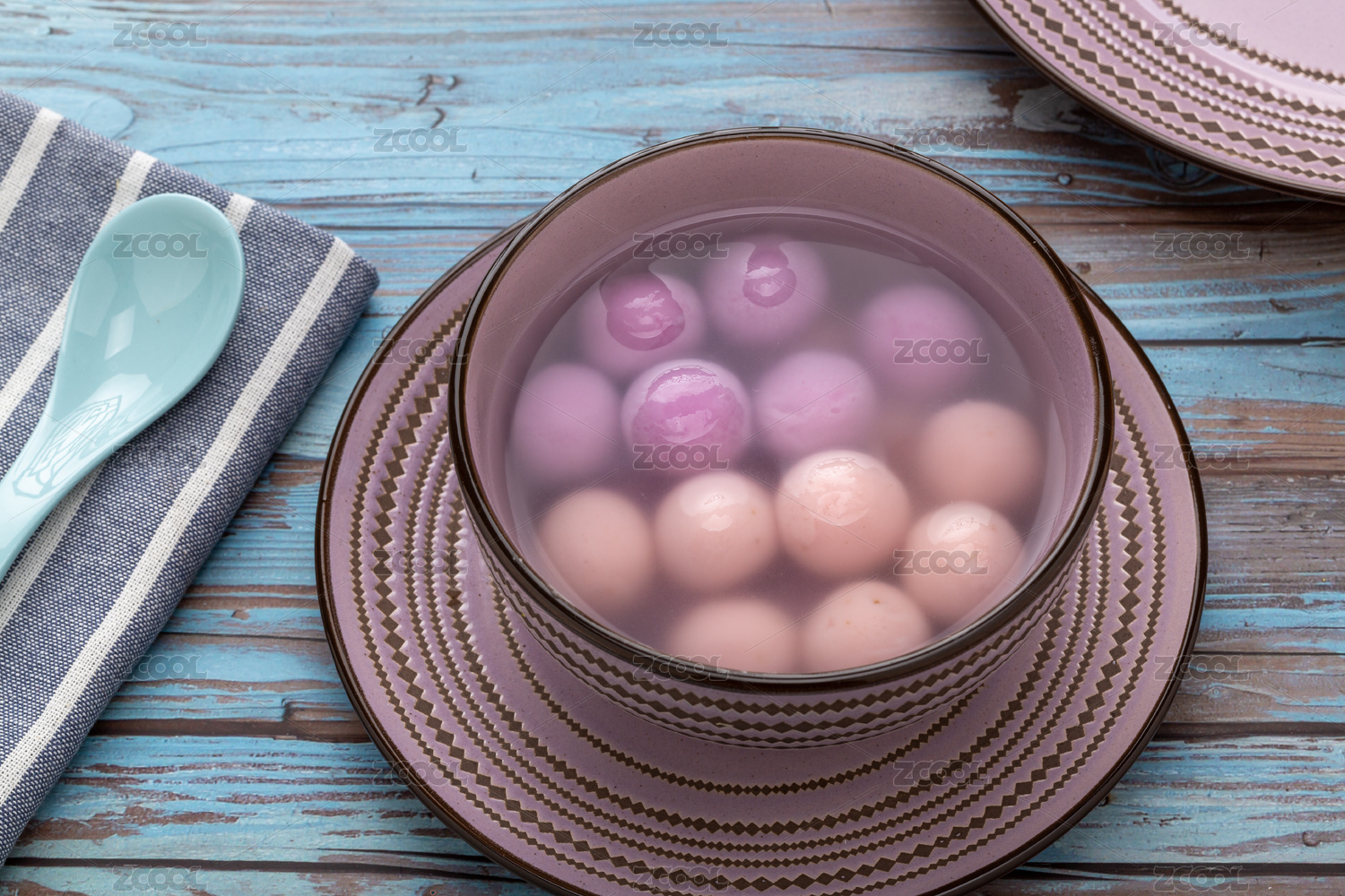 木纹桌面上的一碗汤圆和针织围巾帽子