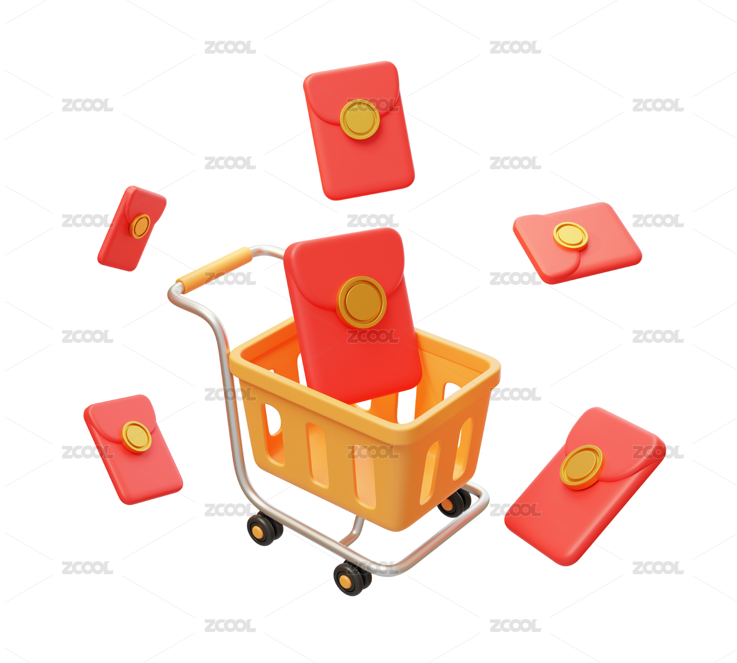 年货节购物车和年货礼物盒红包鞭炮购物车