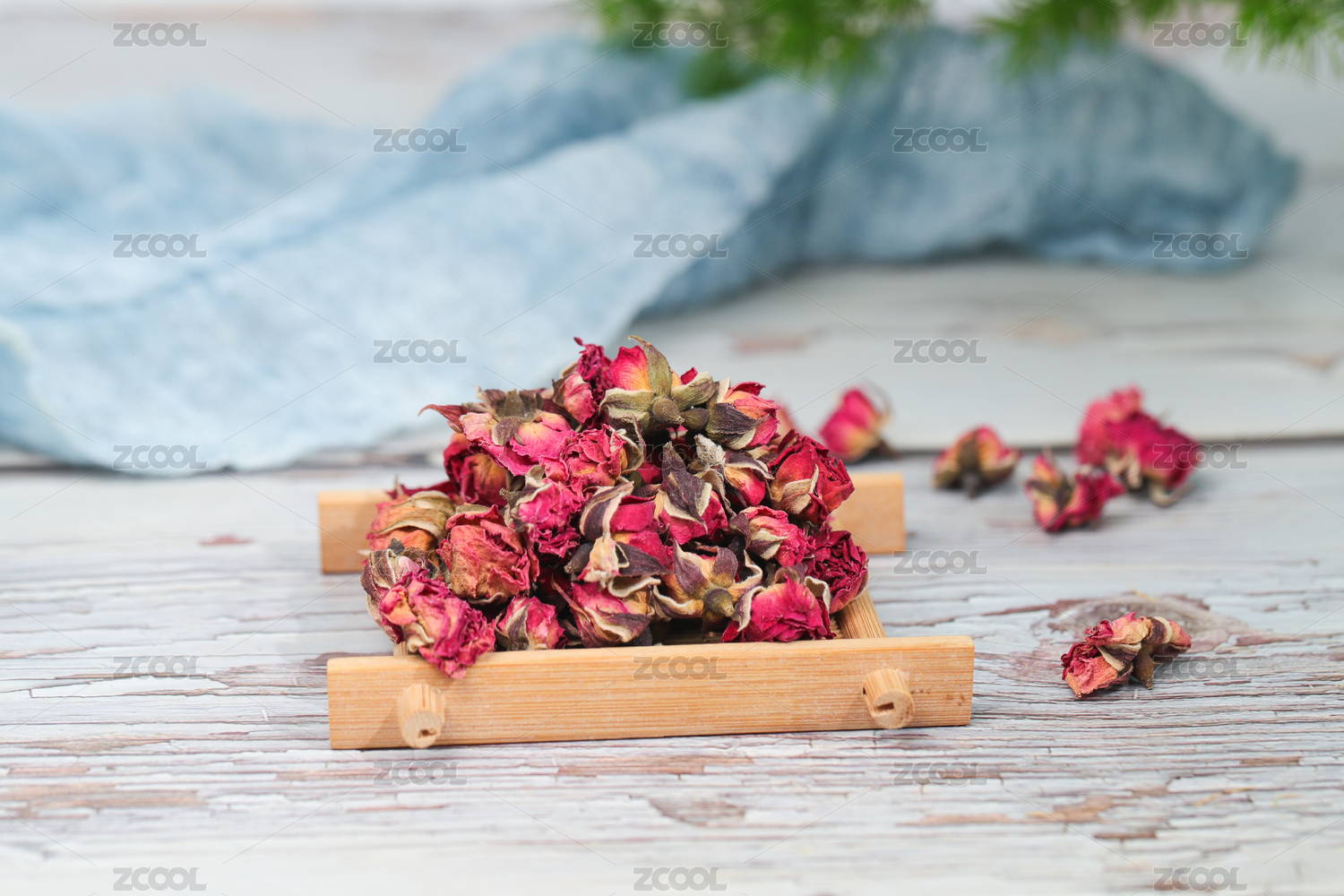 传统棉布上的木盘子里的玫瑰花