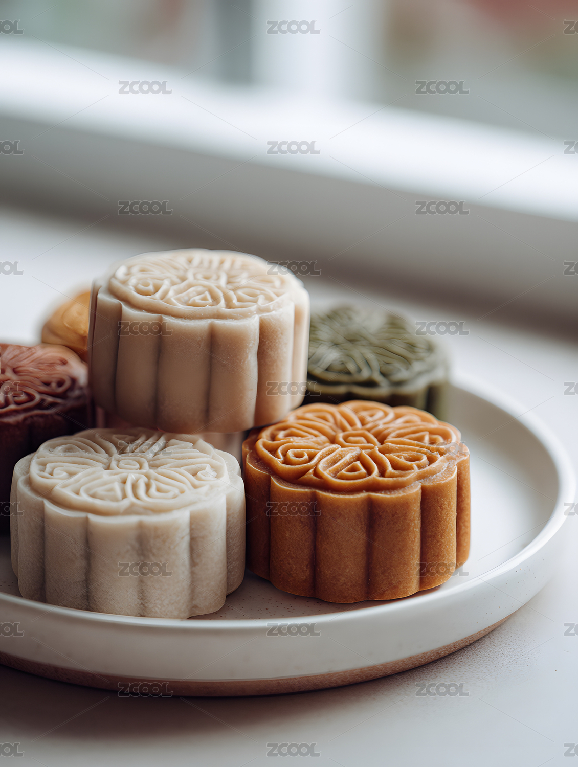 桌面上的盘子里的美味可口的榴莲冰皮月饼