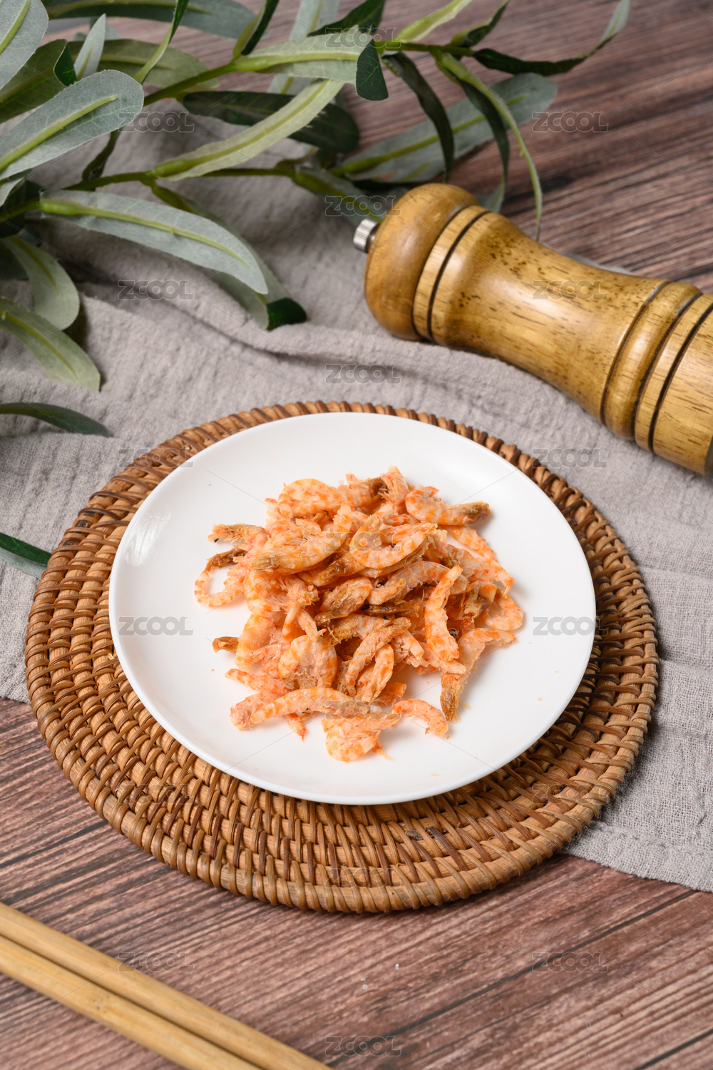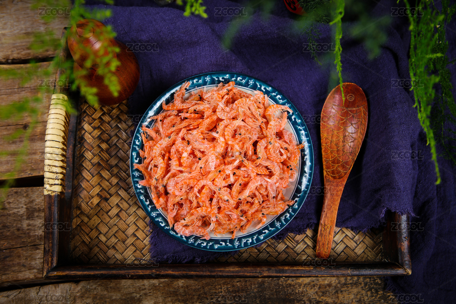 桌面上的盘子里的美味可口的干虾米