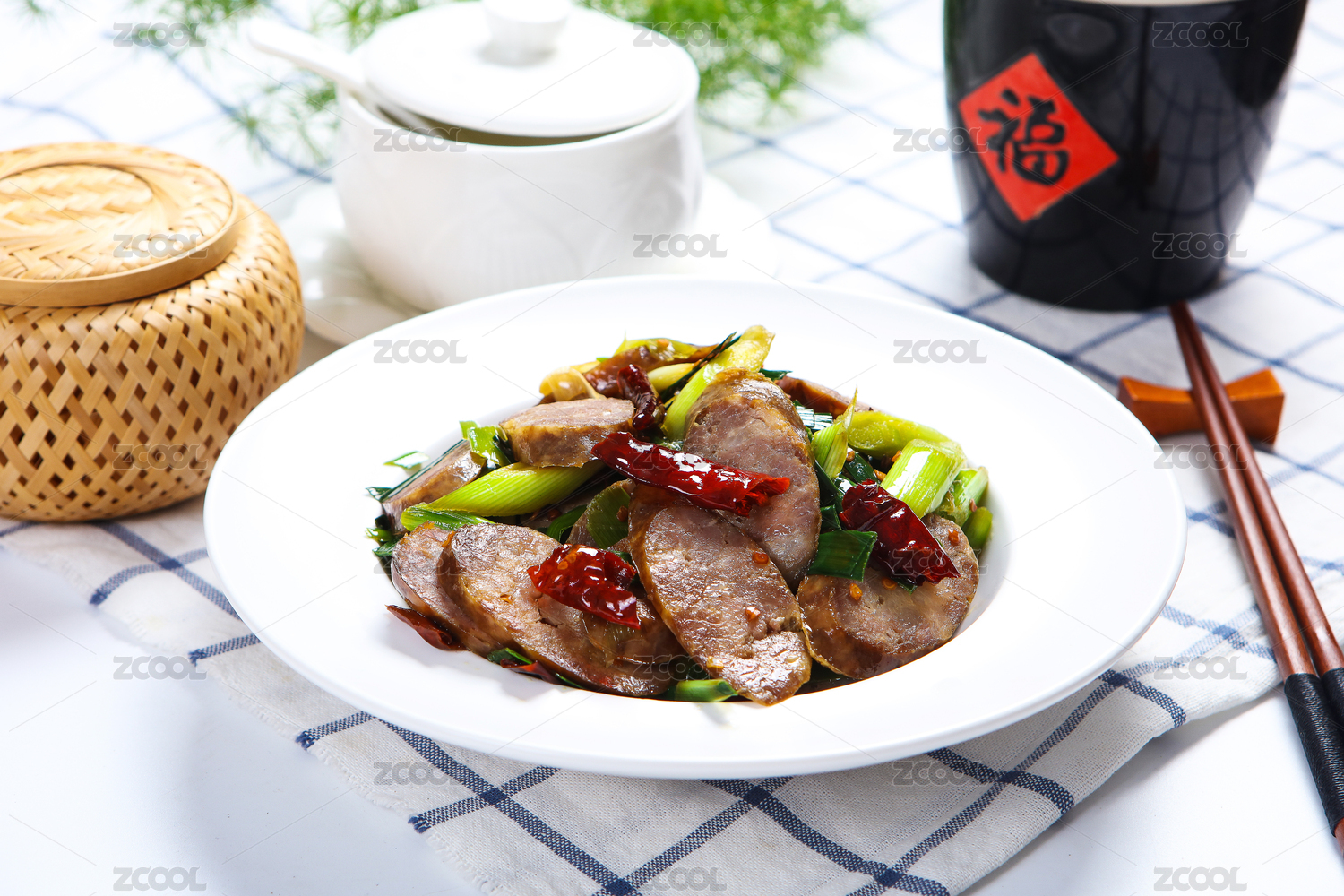用餐盘装着的菜肴蒜苗炒血豆腐