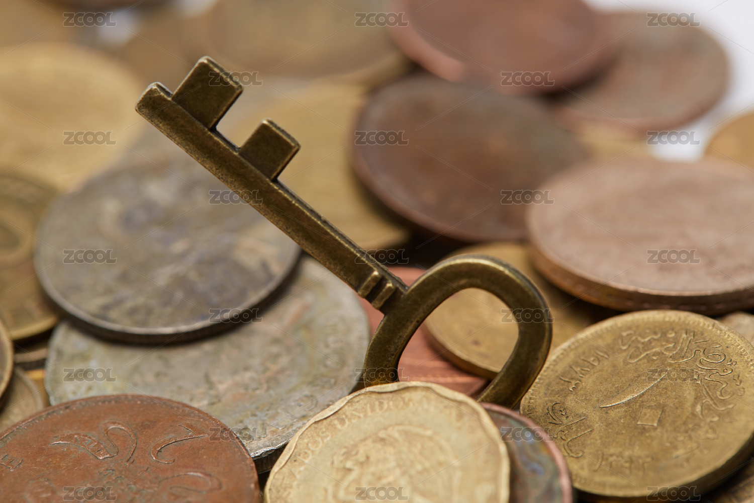大量美元硬币围绕着一把钥匙