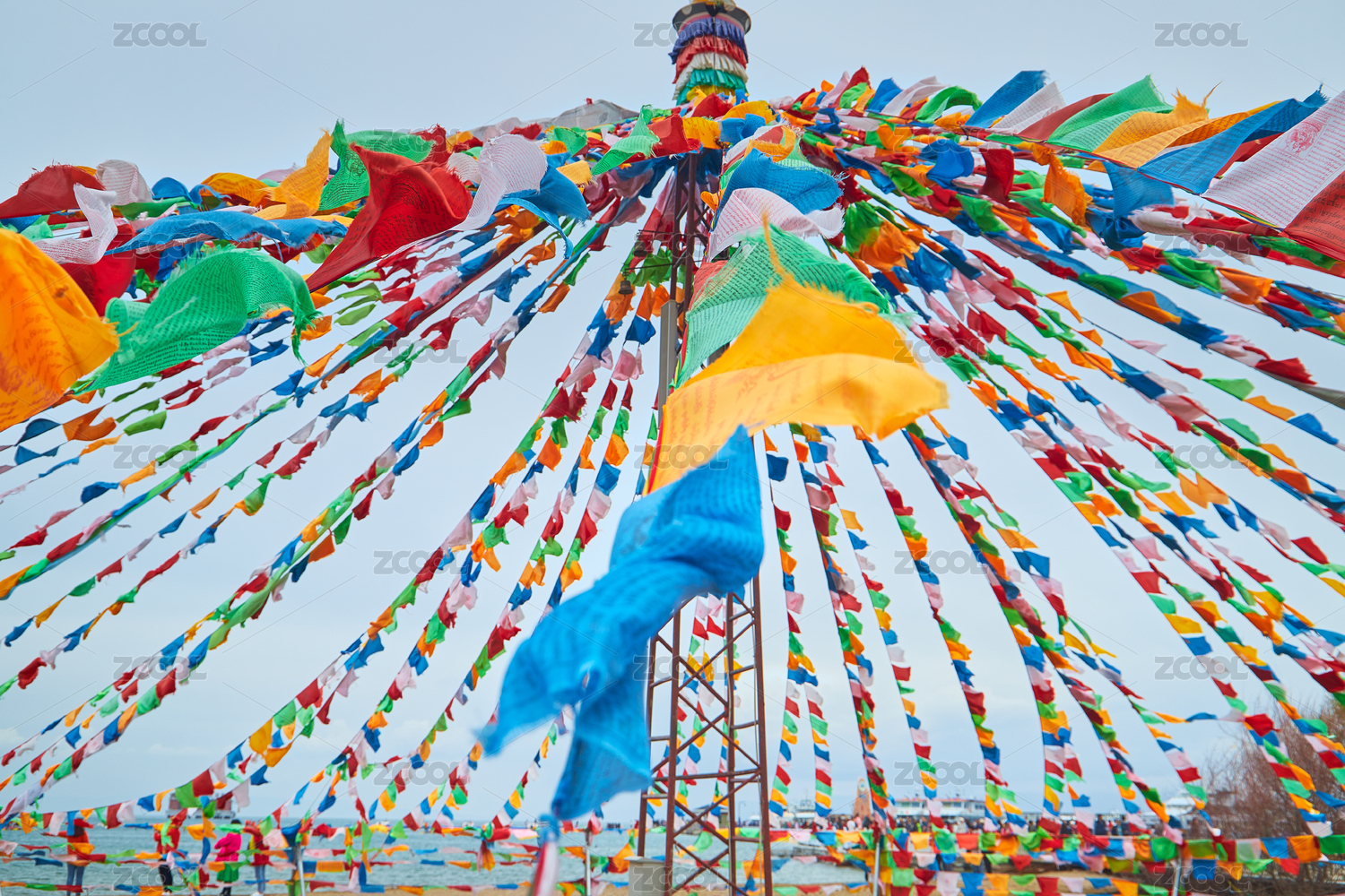 夏天青海省青海湖二郞剑风景区里的藏族经幡