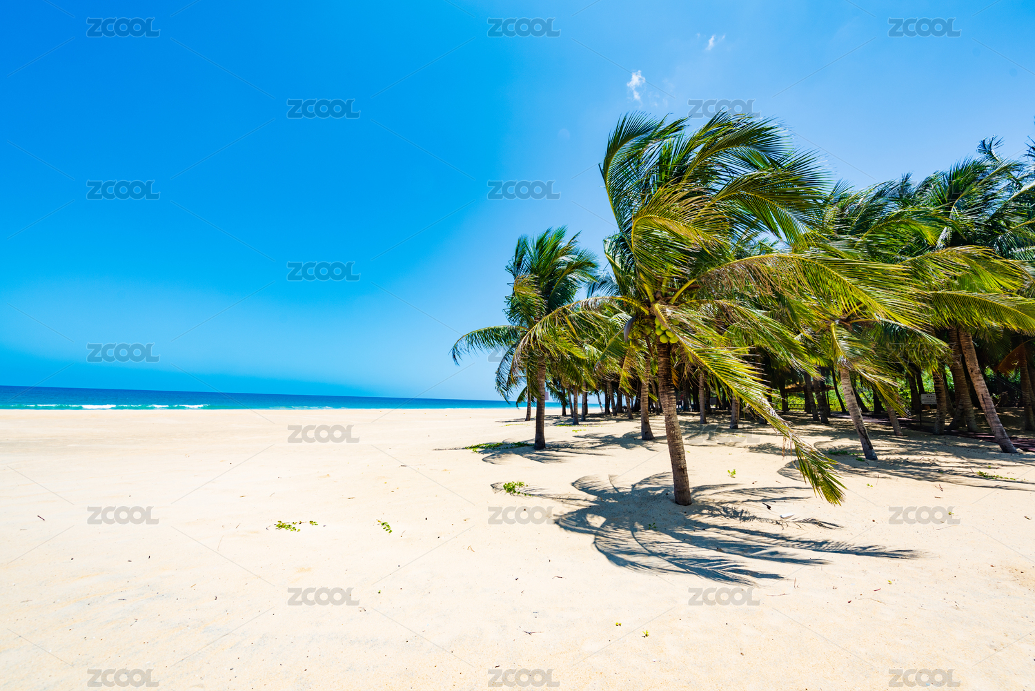广东省雷州半岛海滩蓝天椰子树下的遮阳伞