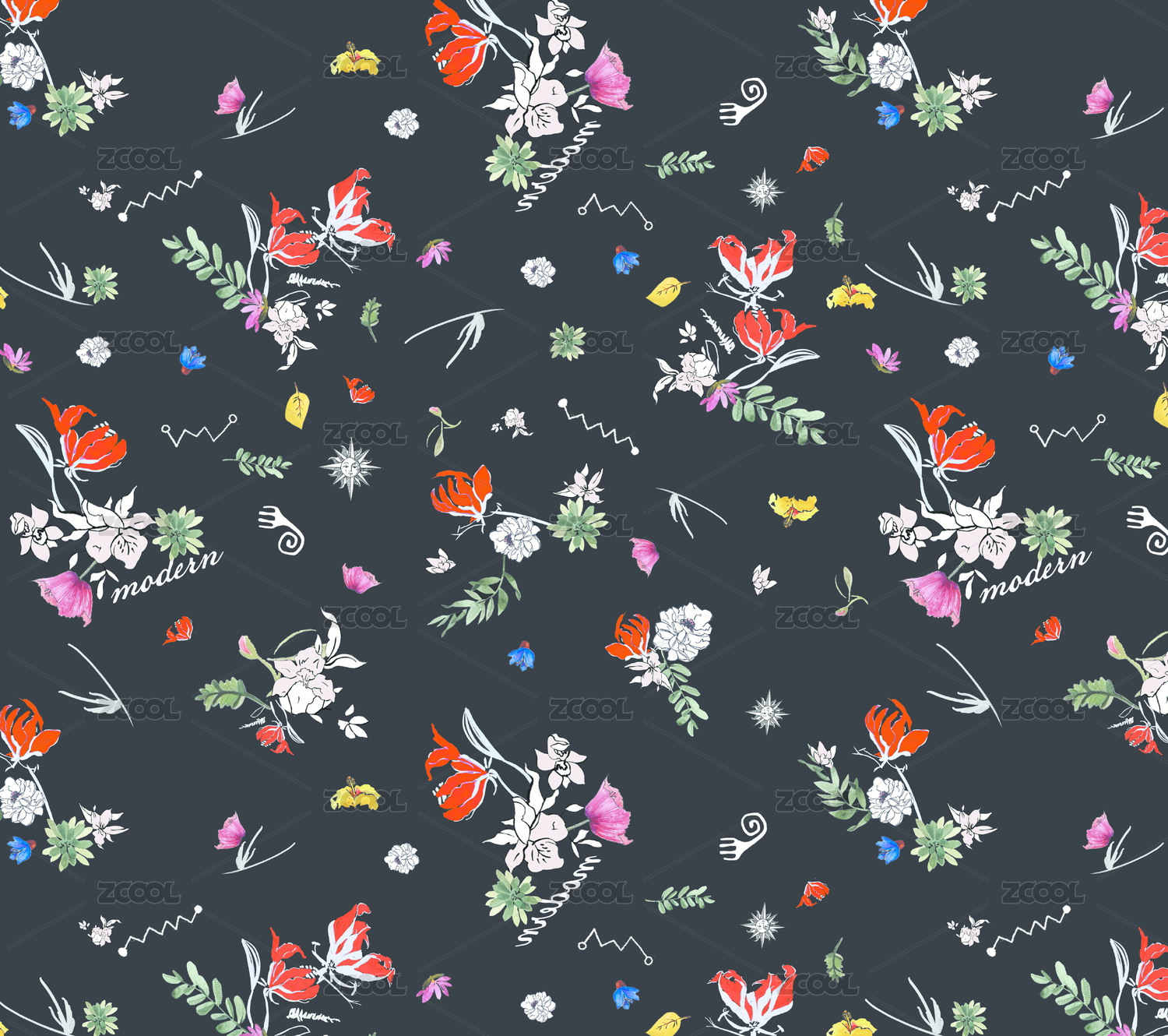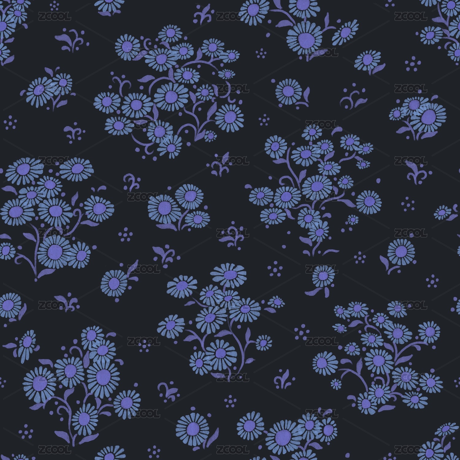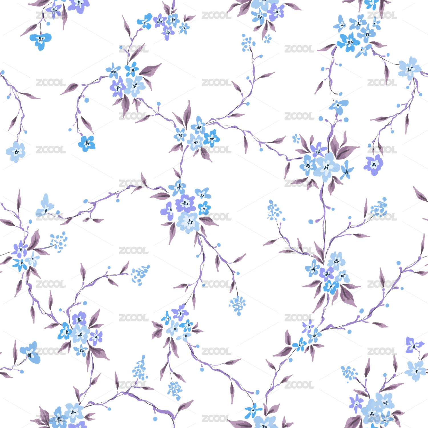 蓝色小清新缠枝藤蔓花卉四方连续无缝图案