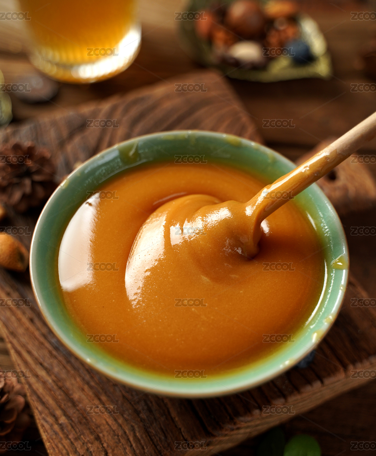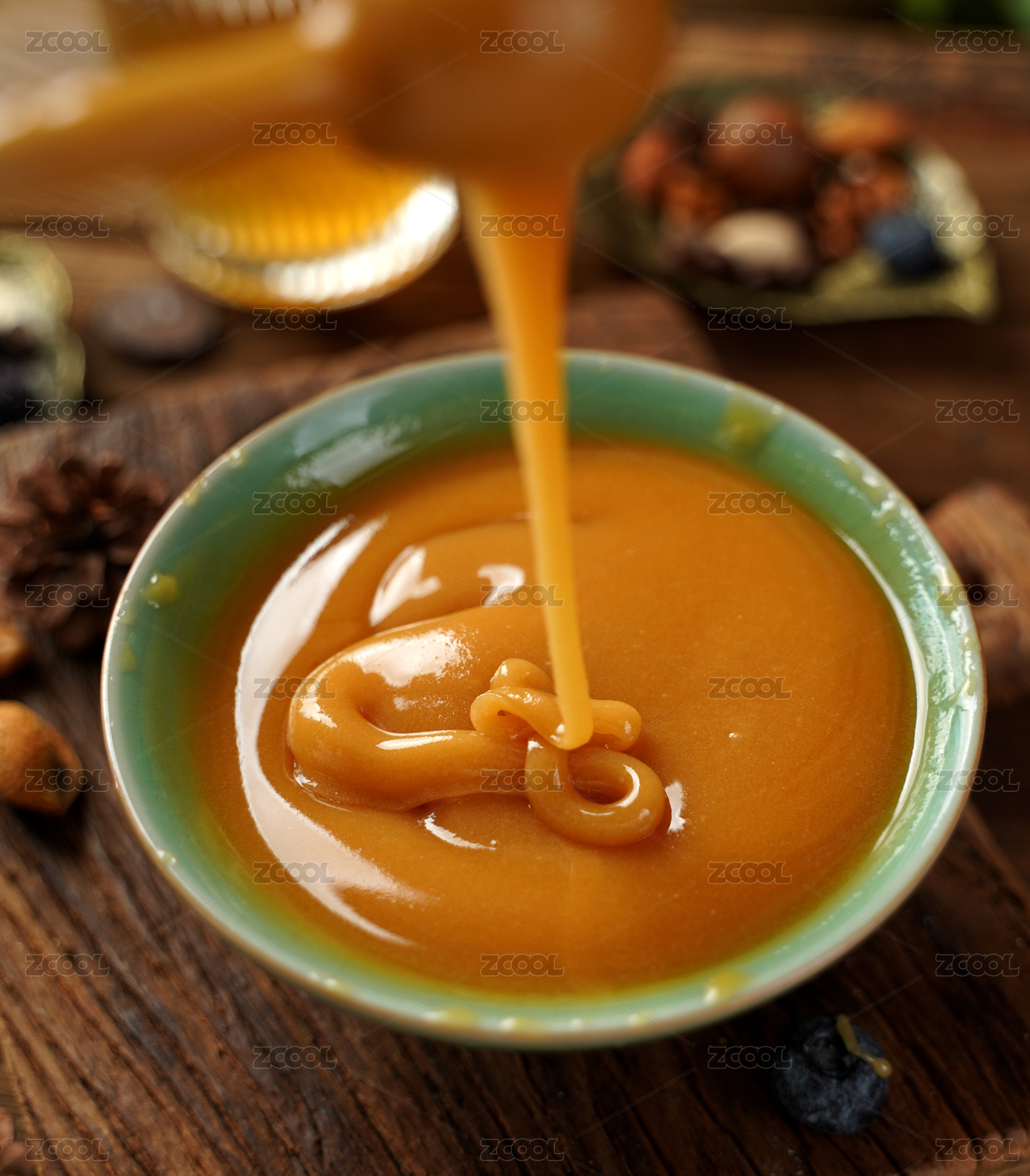 木纹桌面白色瓷盘中的蜂蜜