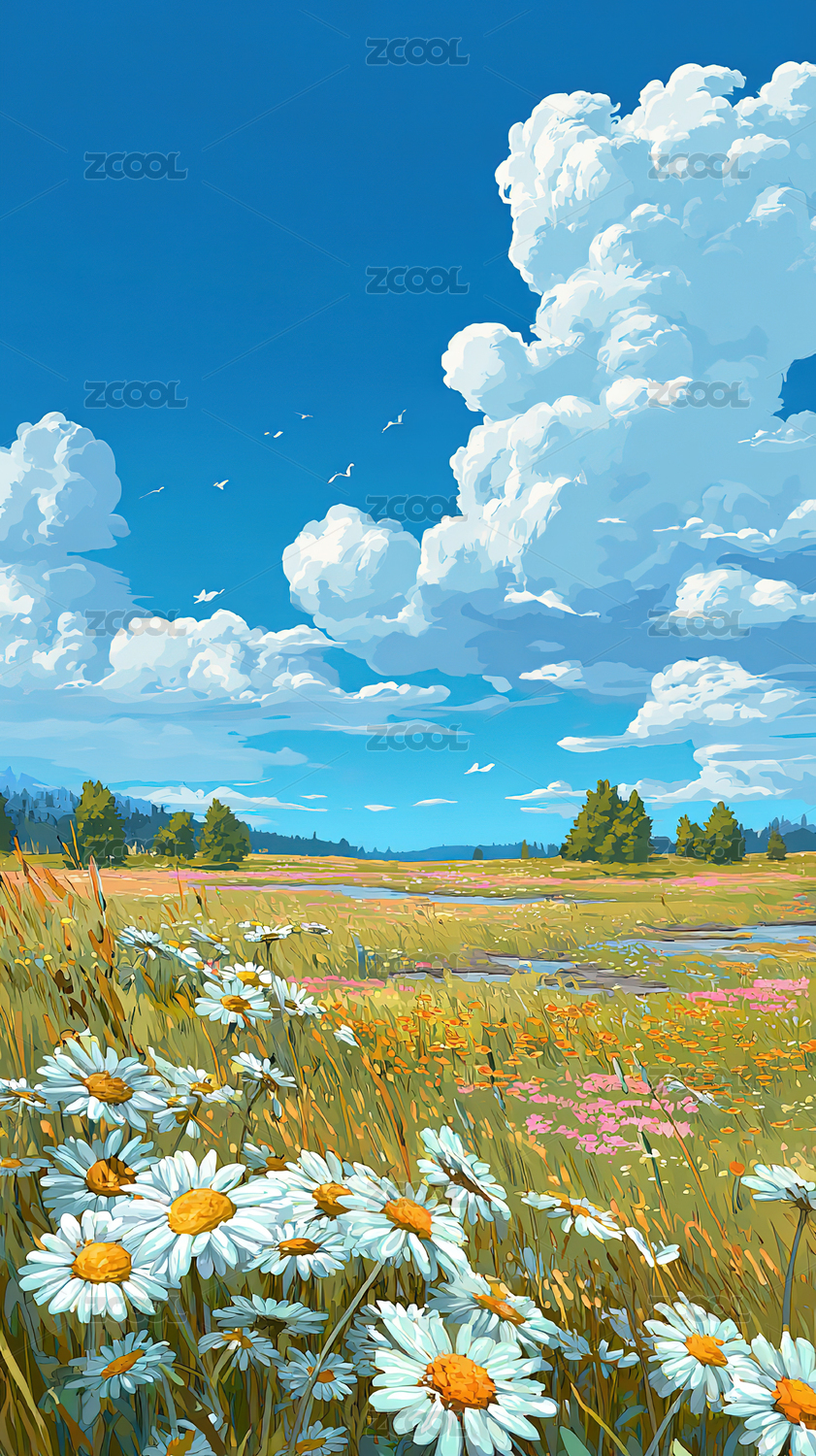 AI数字艺术,花,天空,插画,自然,风景,草地,植物,云,自然美