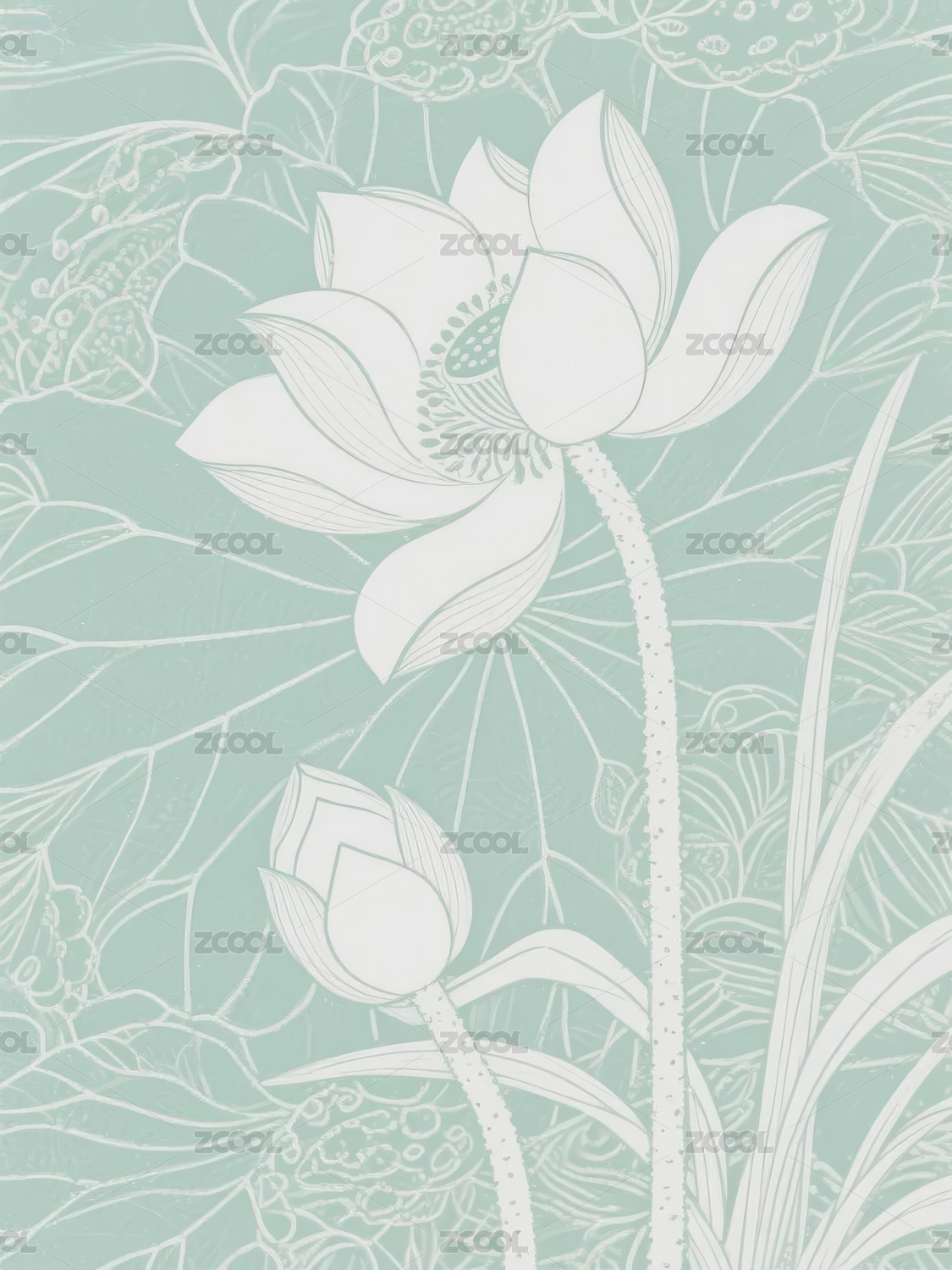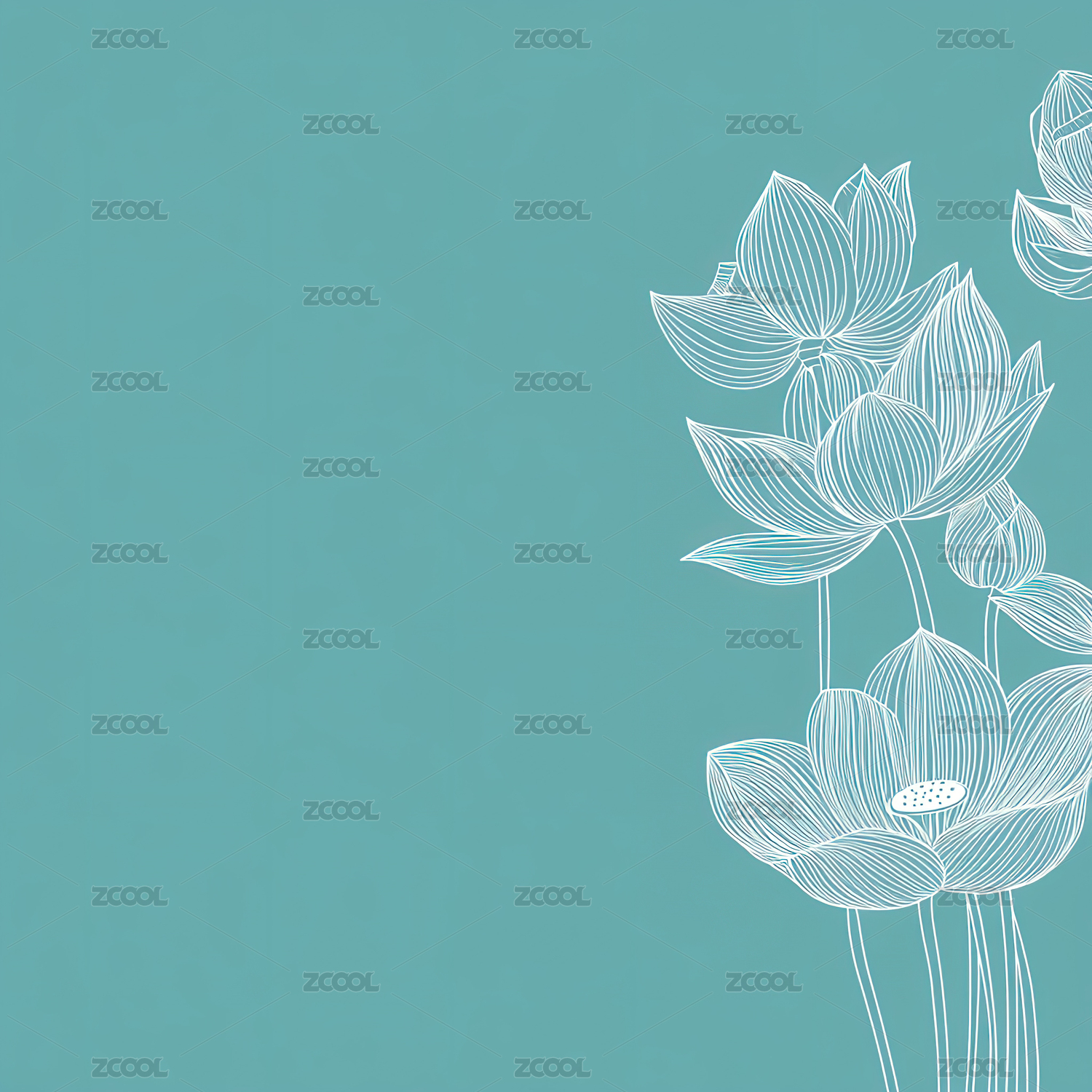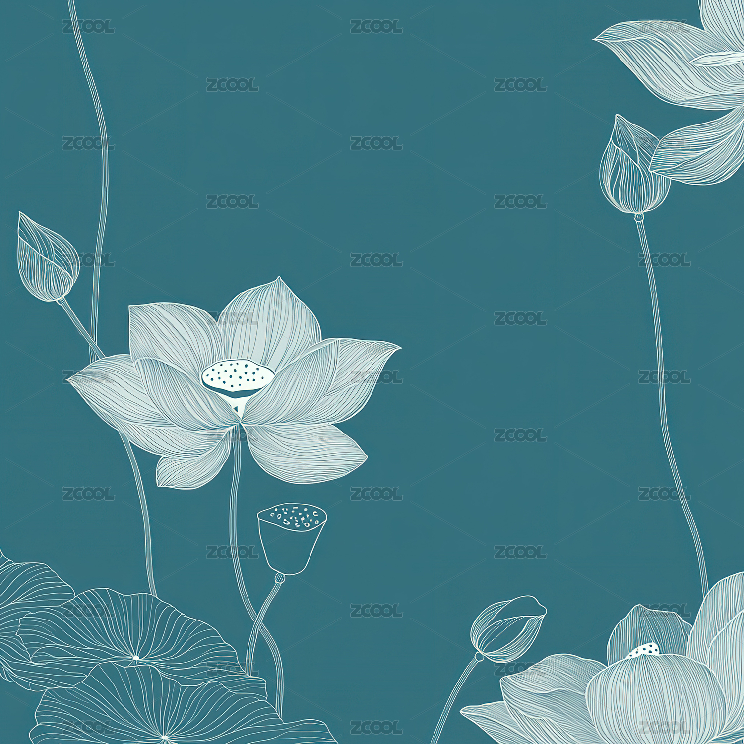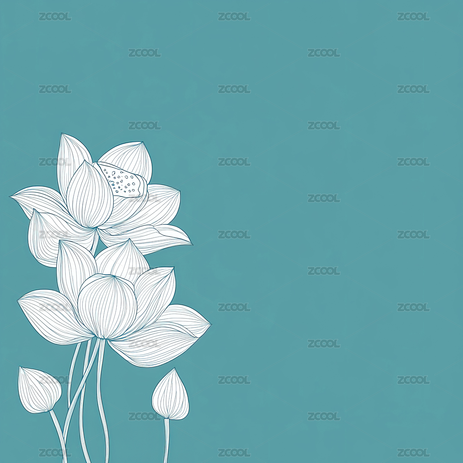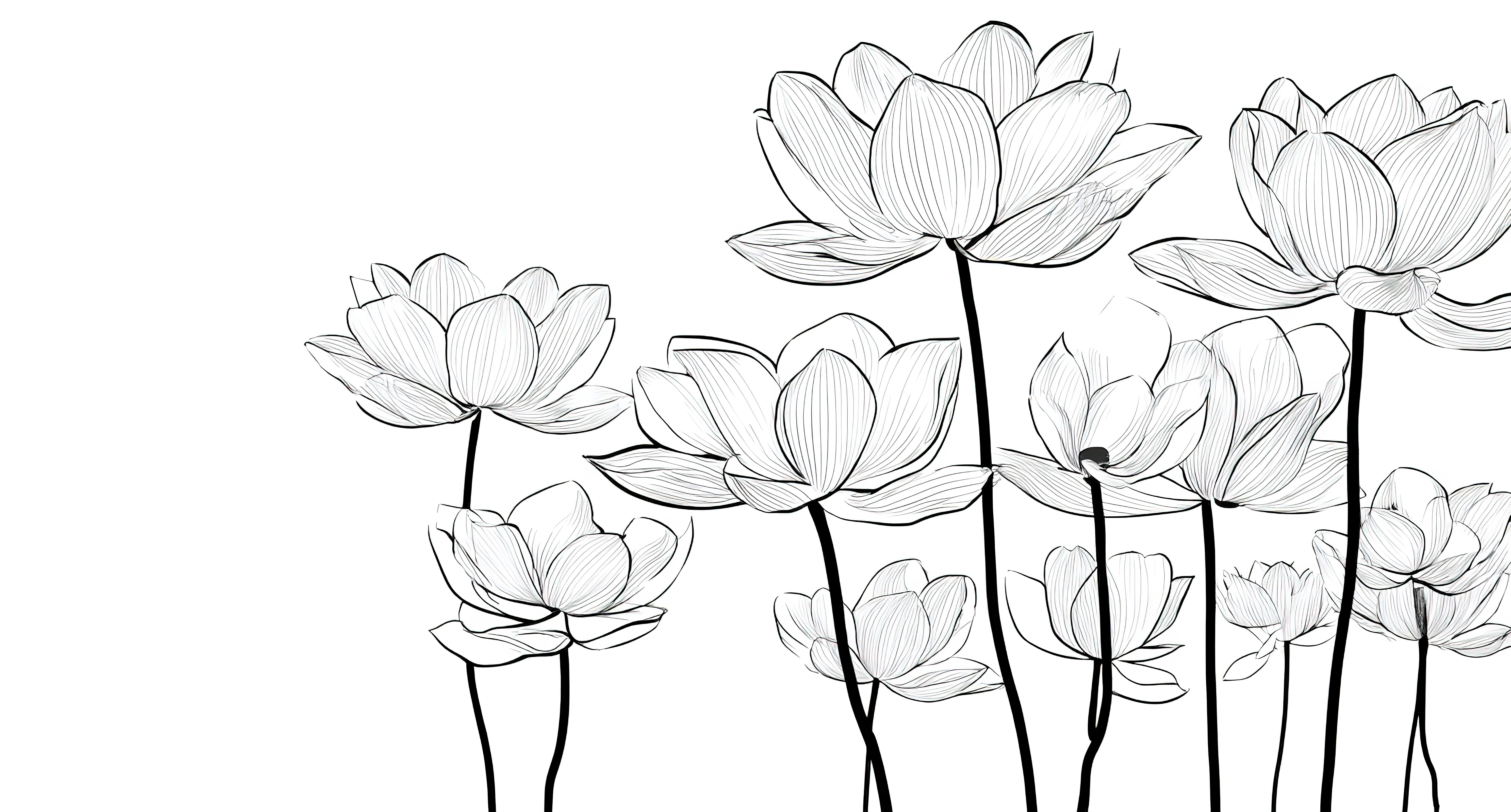 黑白线条绘制的莲花群