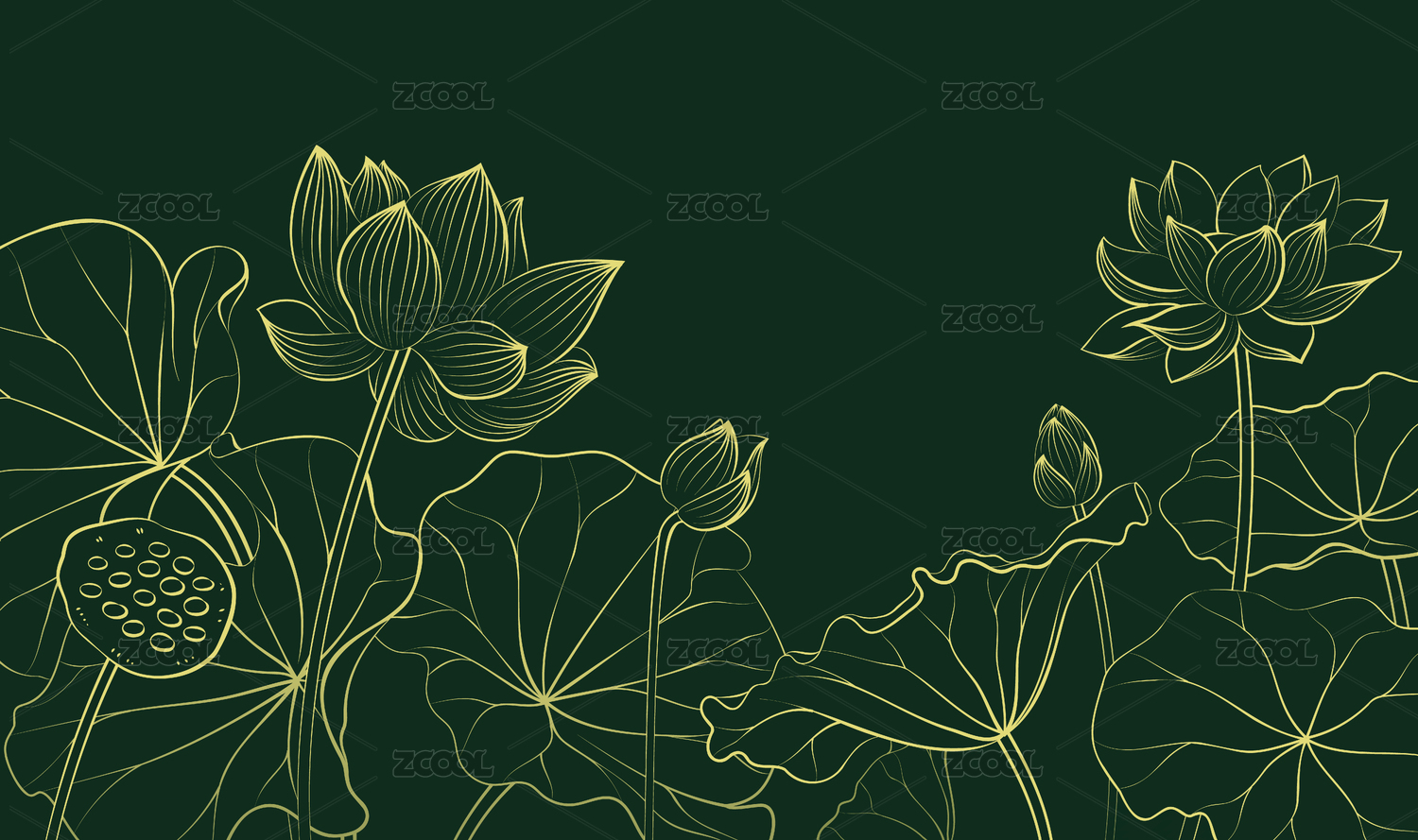 中式红色喜庆背景,金色荷花荷叶线稿