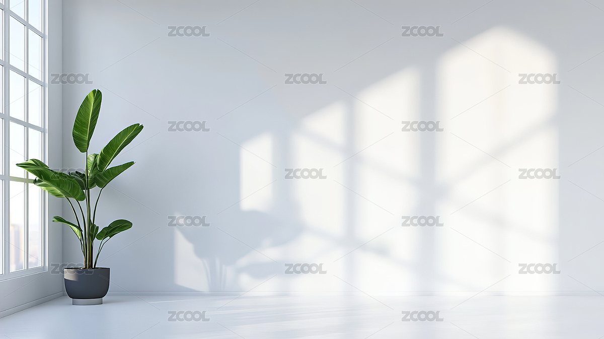 干净的室内白墙和绿植装饰简约空白渲染背景