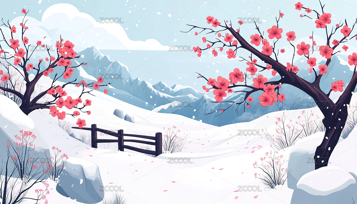 唯美冬天梅花风景插画