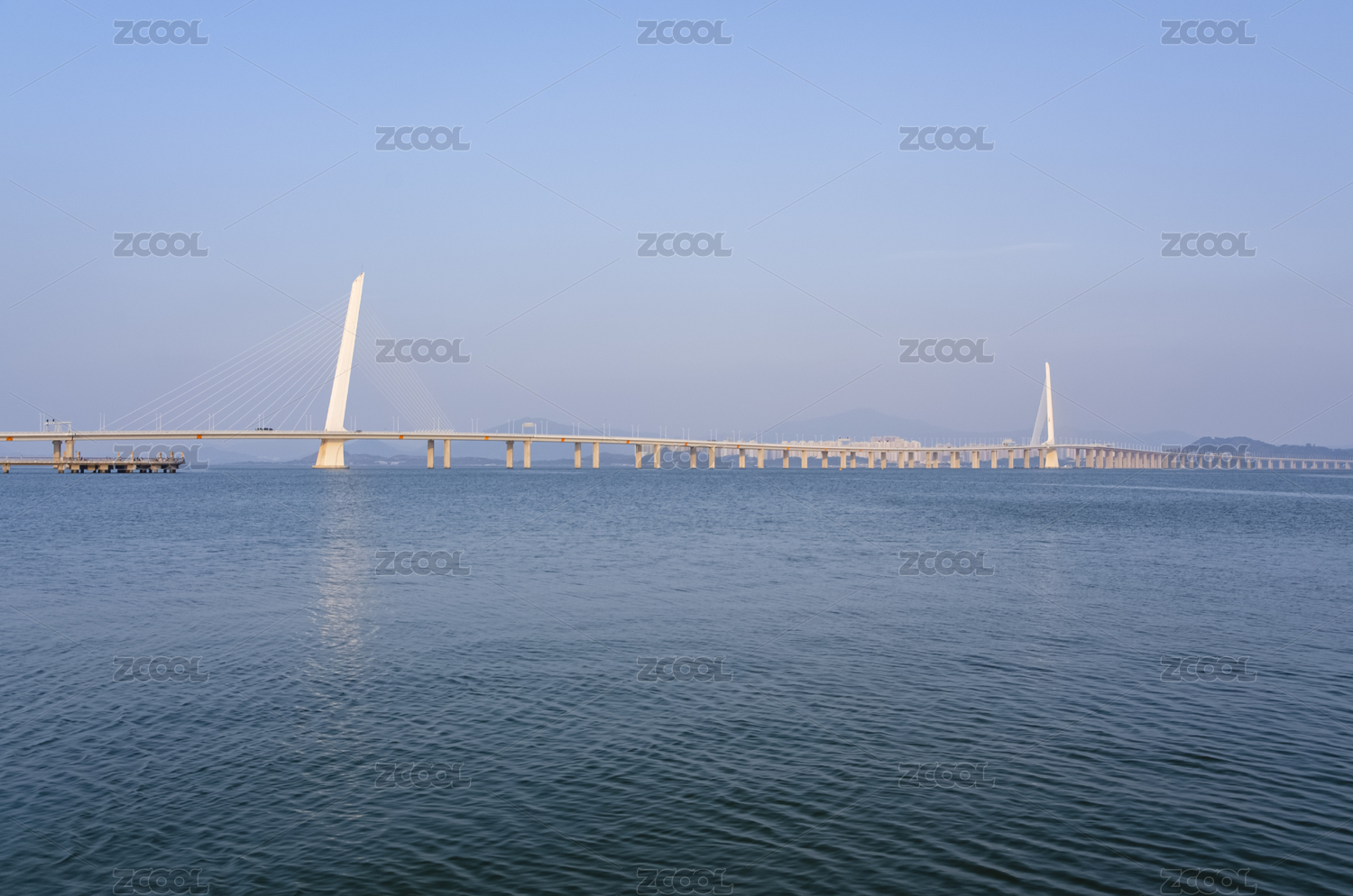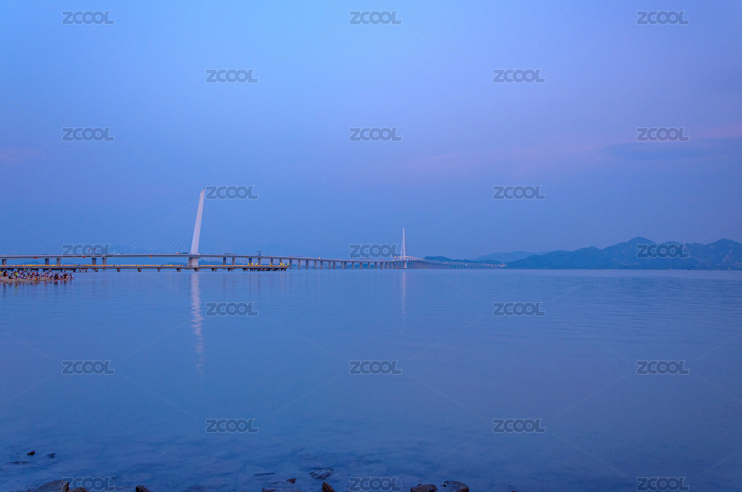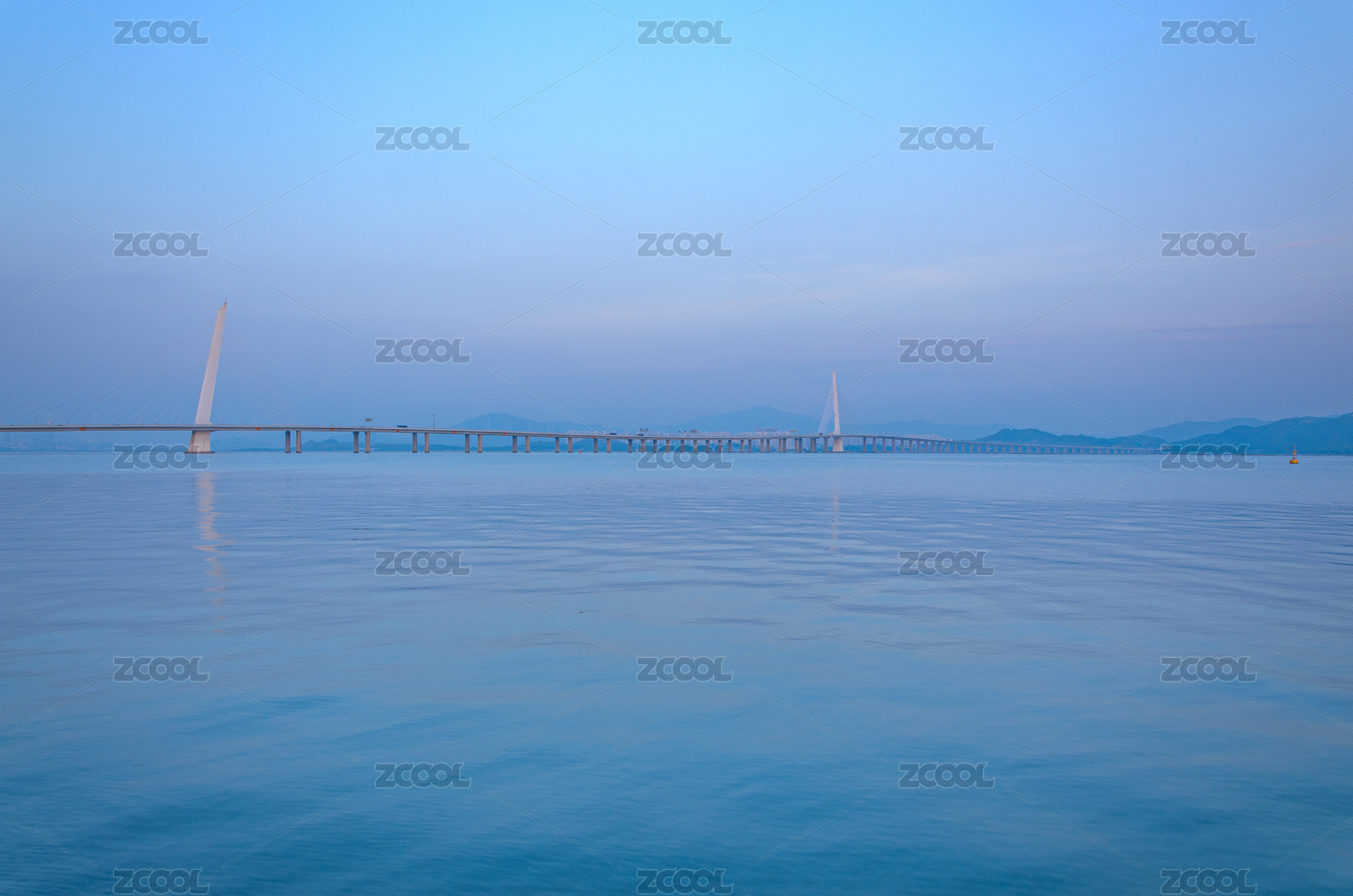 晴天傍晚的蓝色的深圳湾天空和浅蓝色的海面
