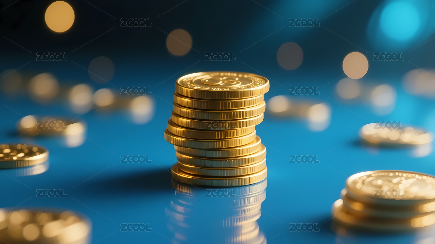 蓝色桌面上的金色硬币