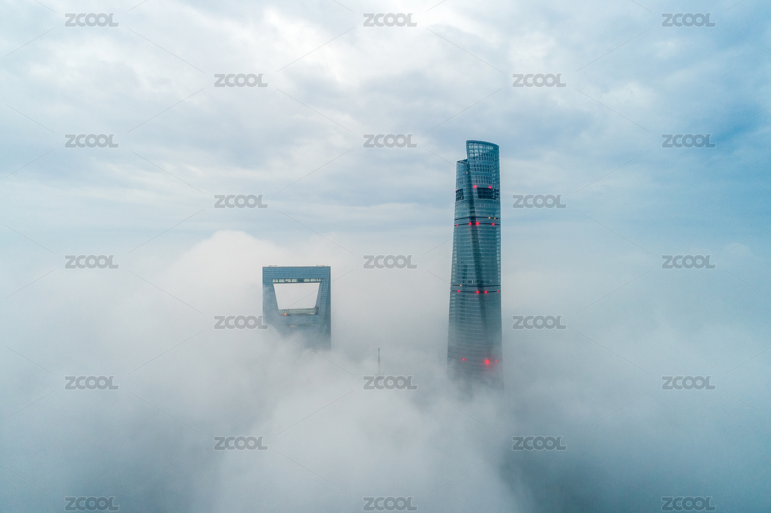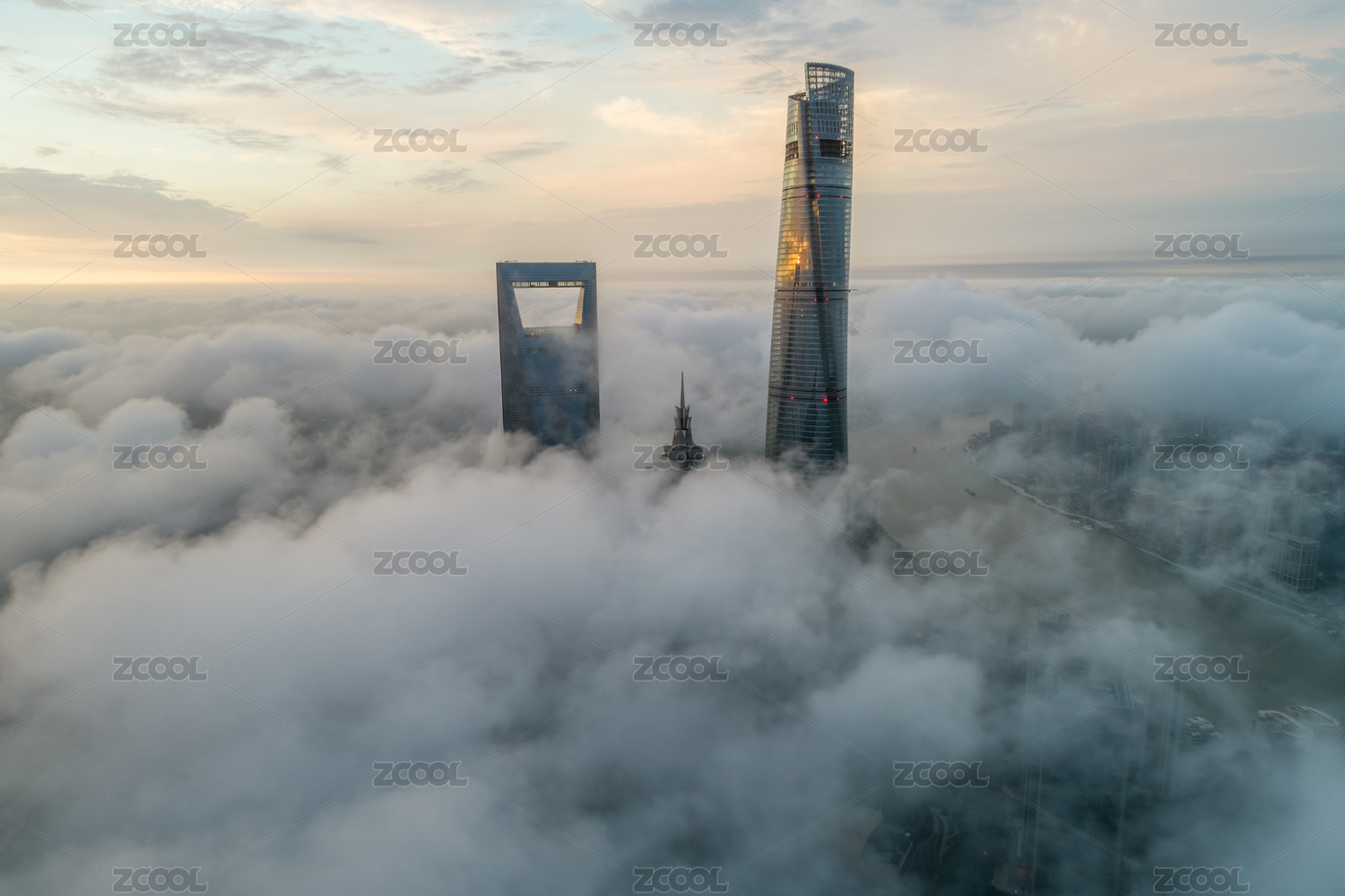 中国上海浦东陆家嘴地标建筑群平流雾航拍