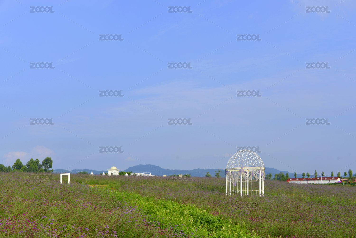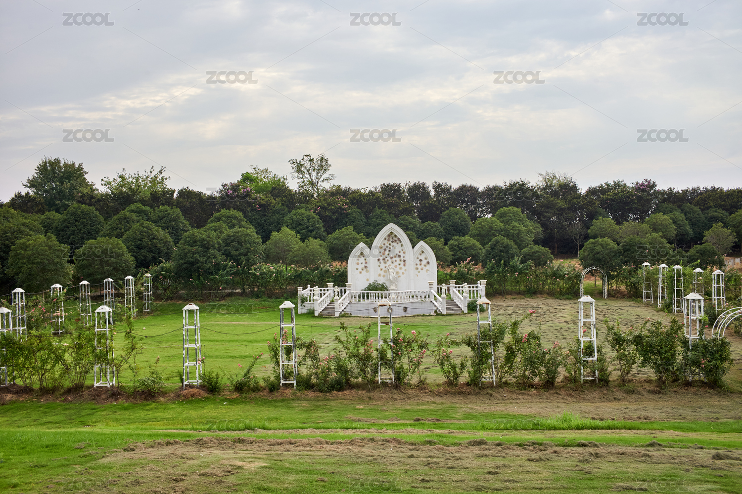 鲜花篱笆围绕的仿罗马建筑舞台