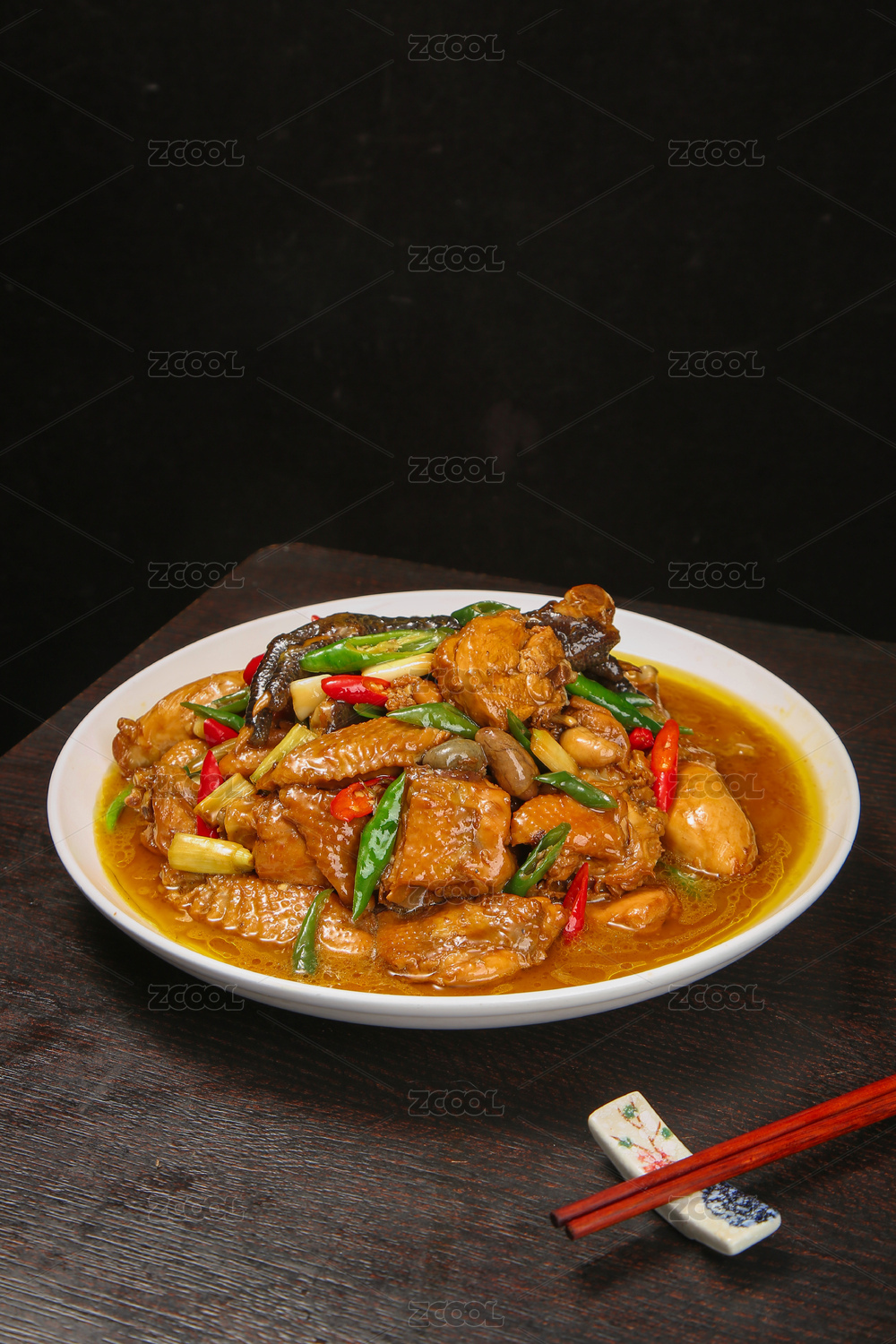 浅蓝色背景上黑色瓷碗中的辣椒炒肉