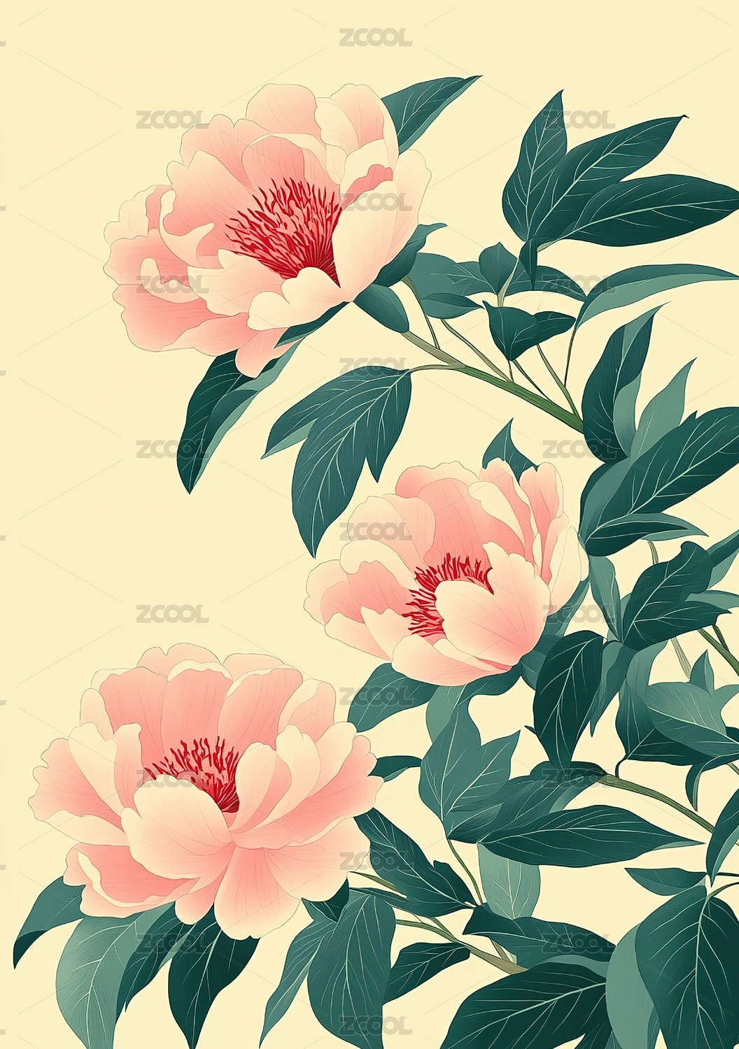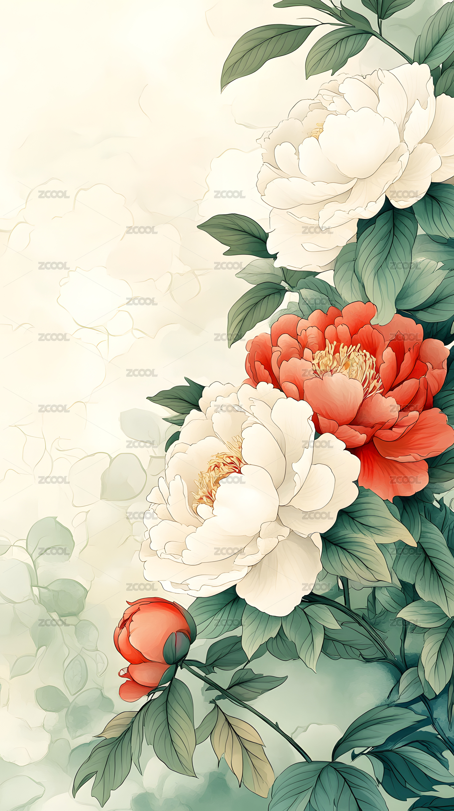 国潮牡丹花,中国风工笔画牡丹花卉插画