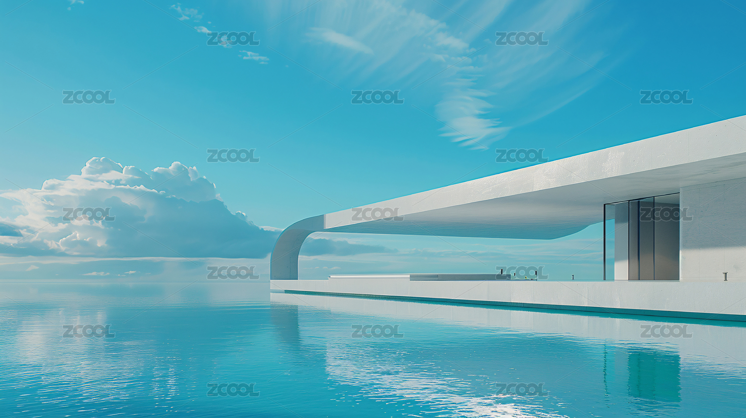 海边带泳池混凝土建筑与砖地露台有天空背景
