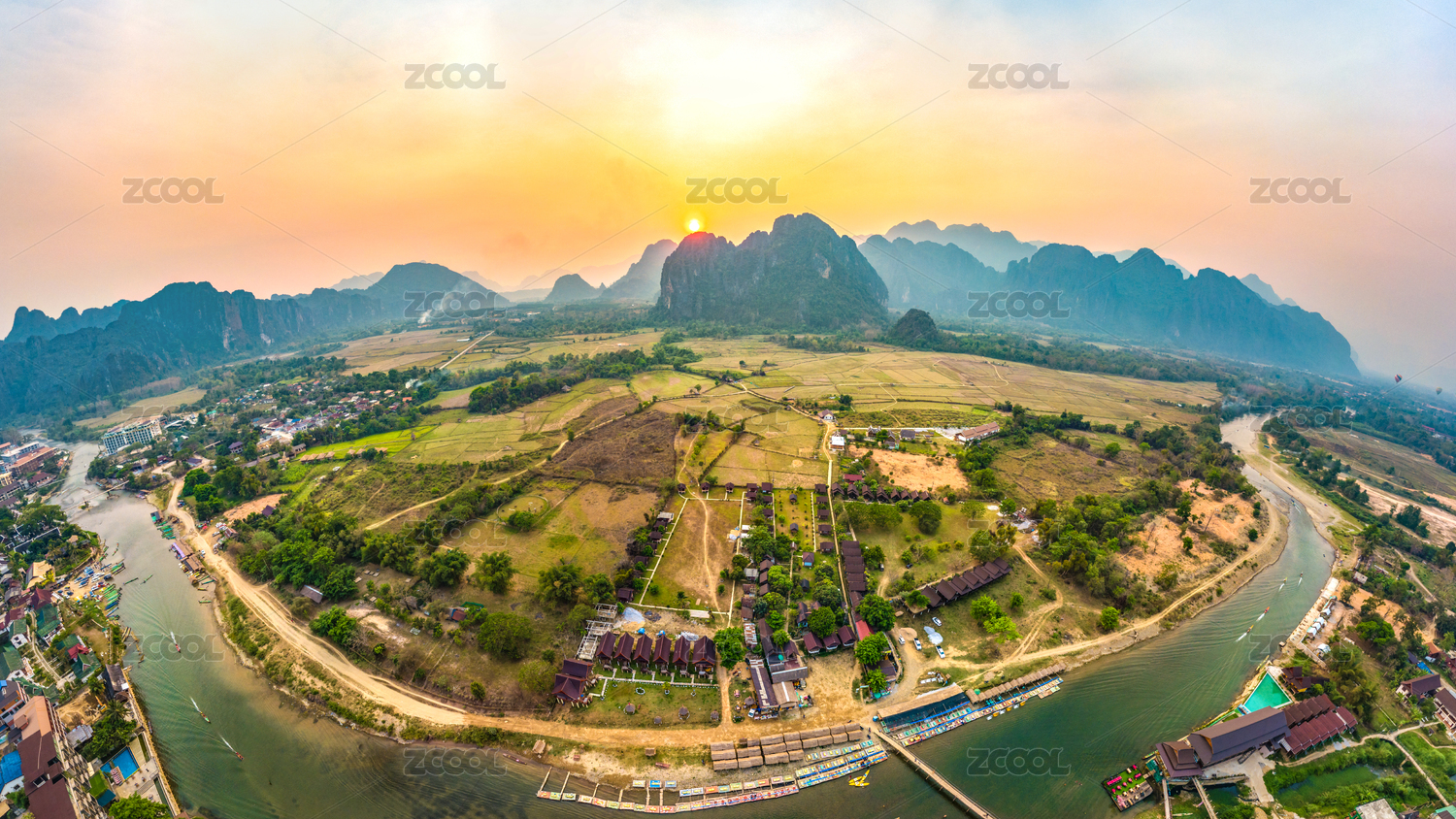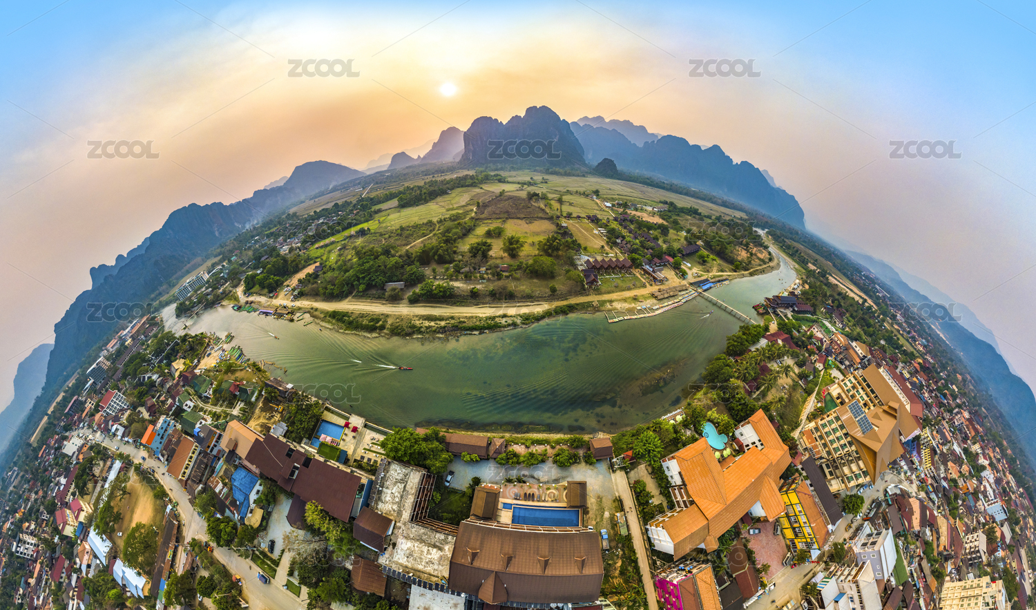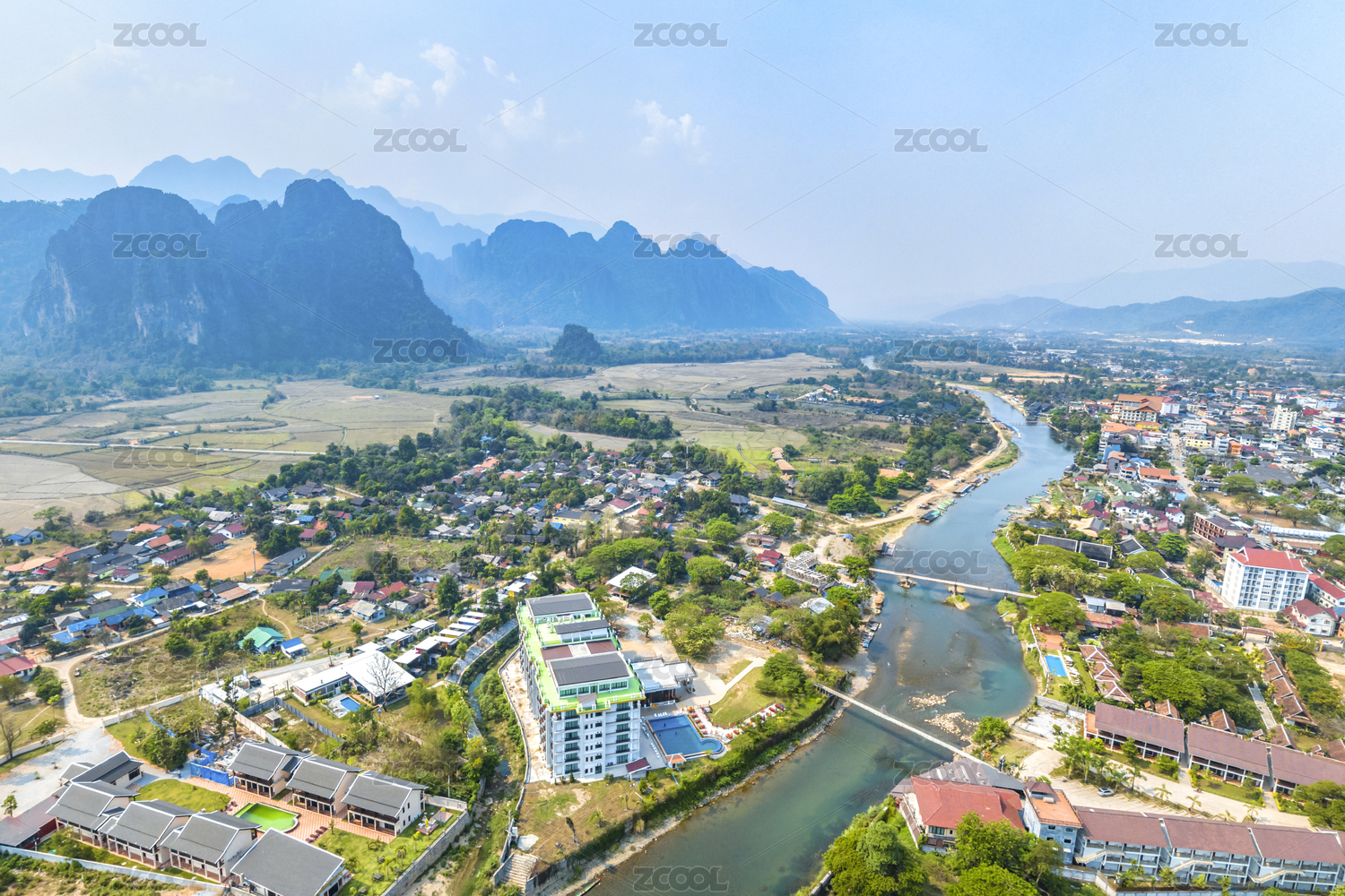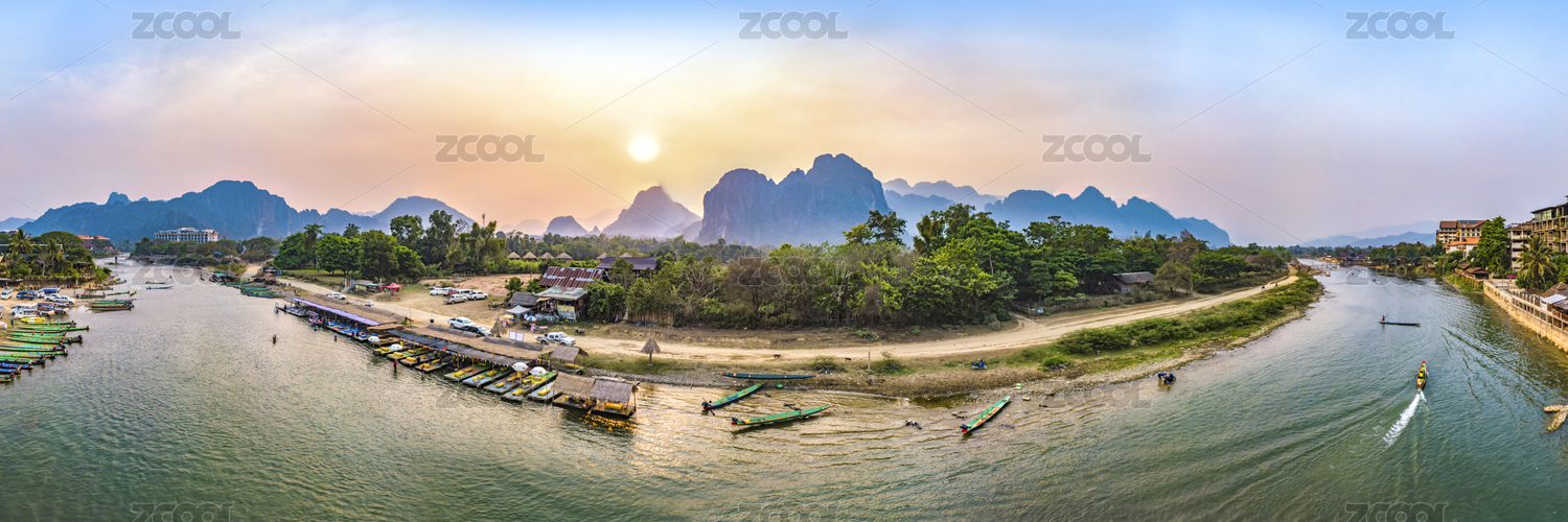Panoramic Landscape and Townscape of Vang Vieng, Laos, Southeast Asia