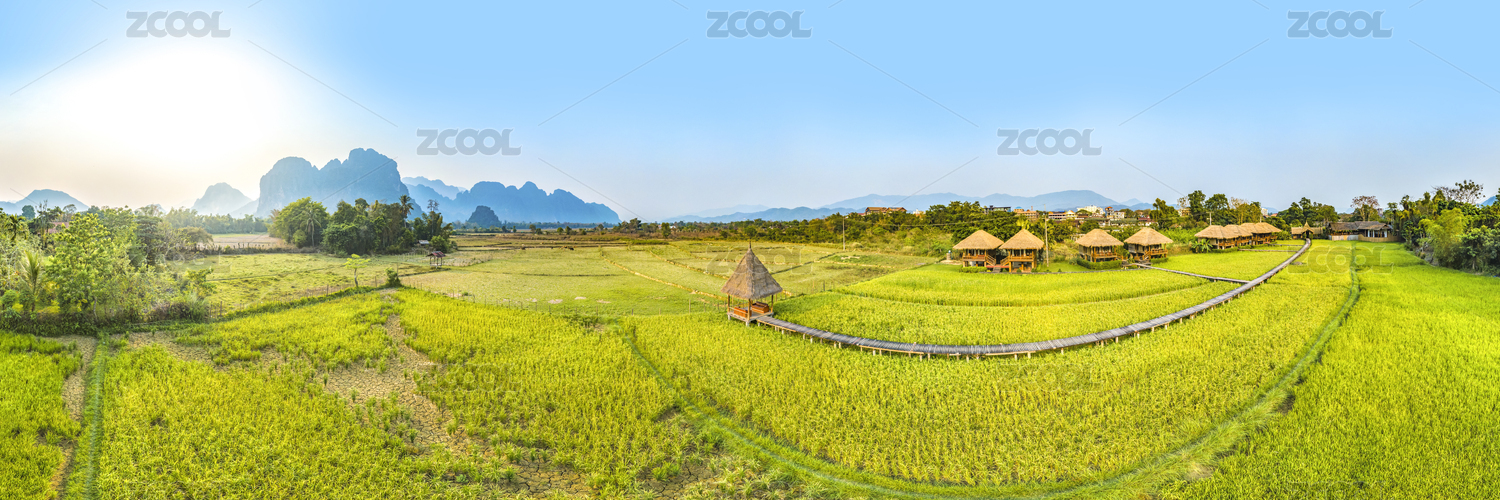 Golden Rice Paddy Field and Cottage Villas in Vang Vieng, Laos, Southeast Asia