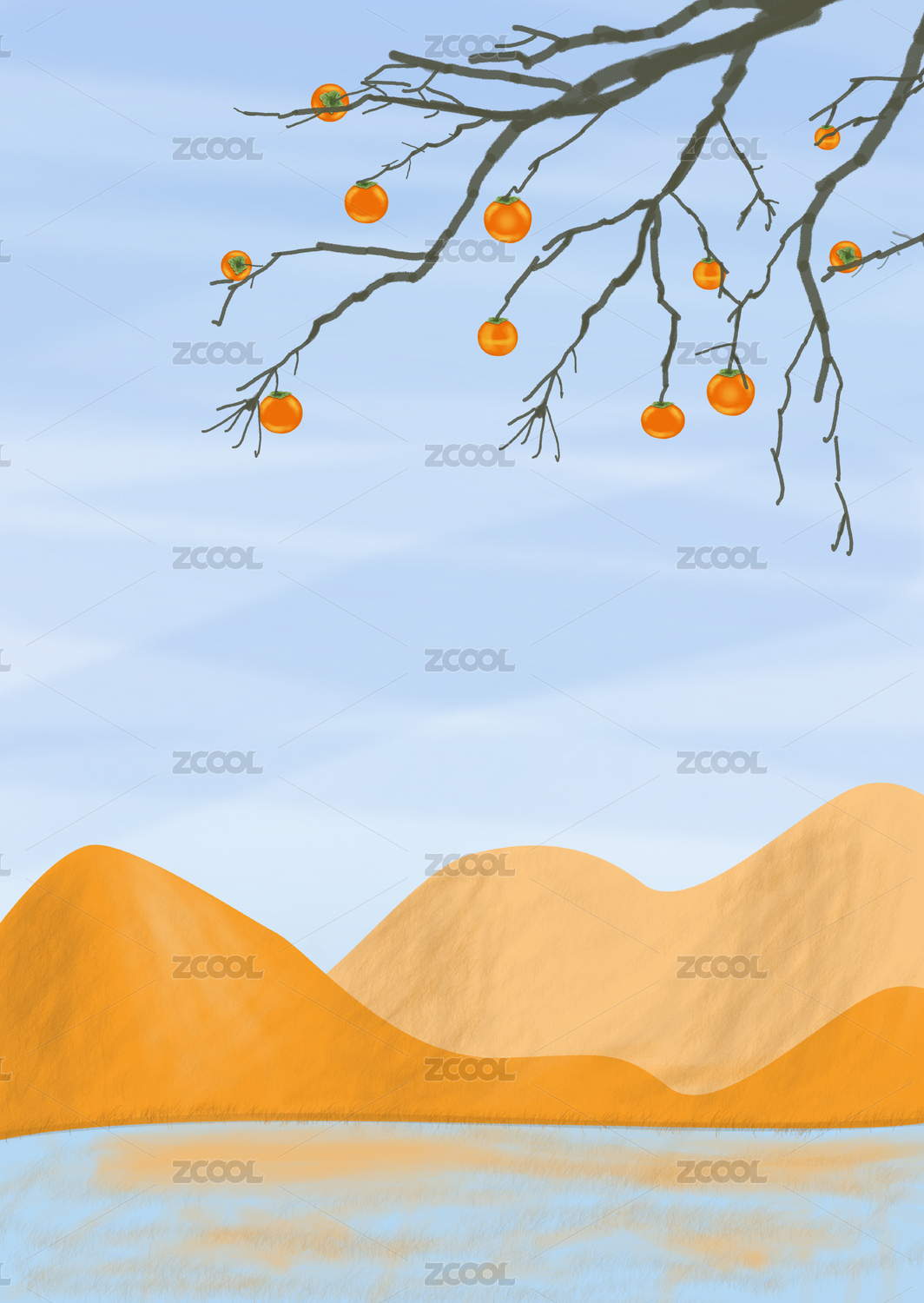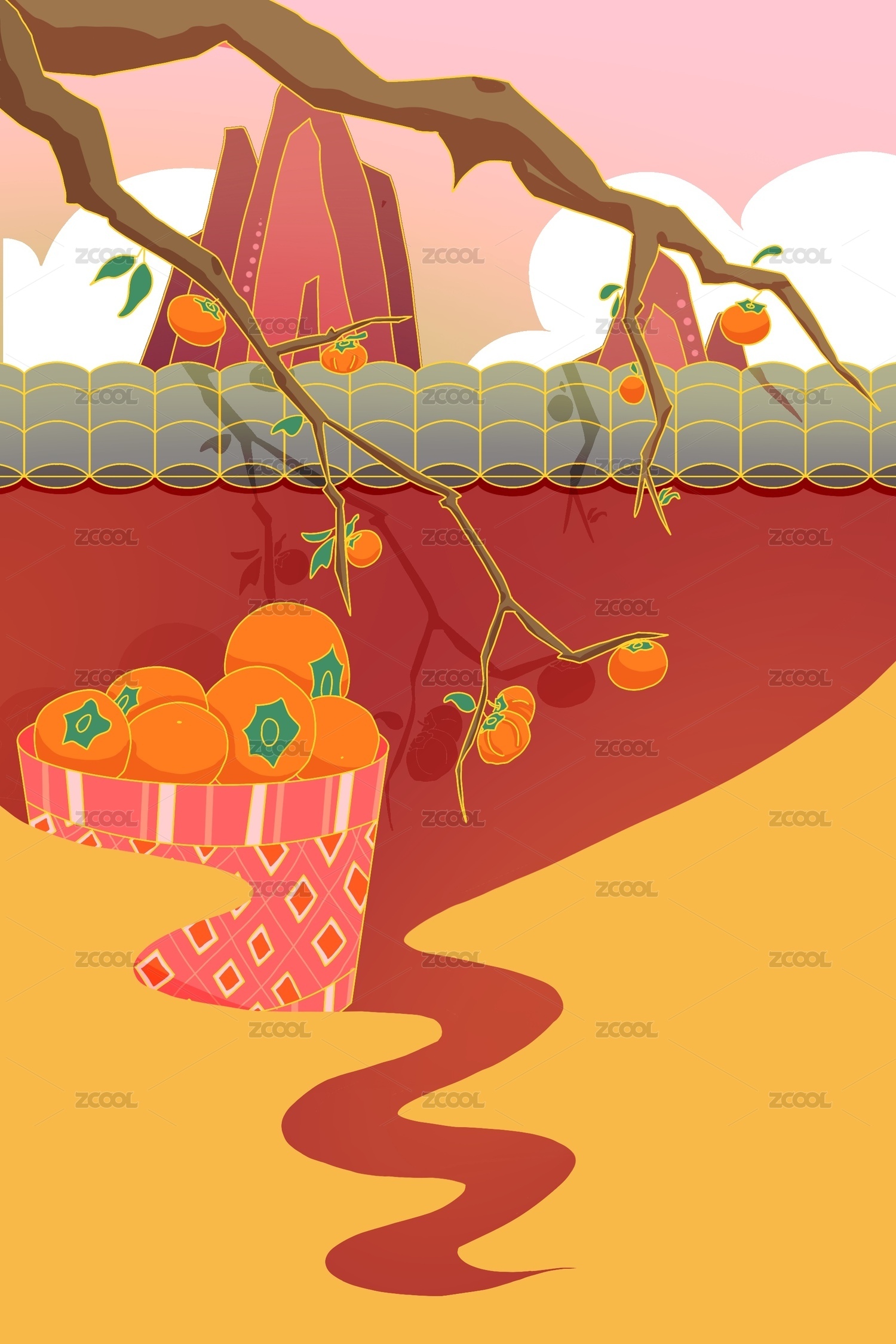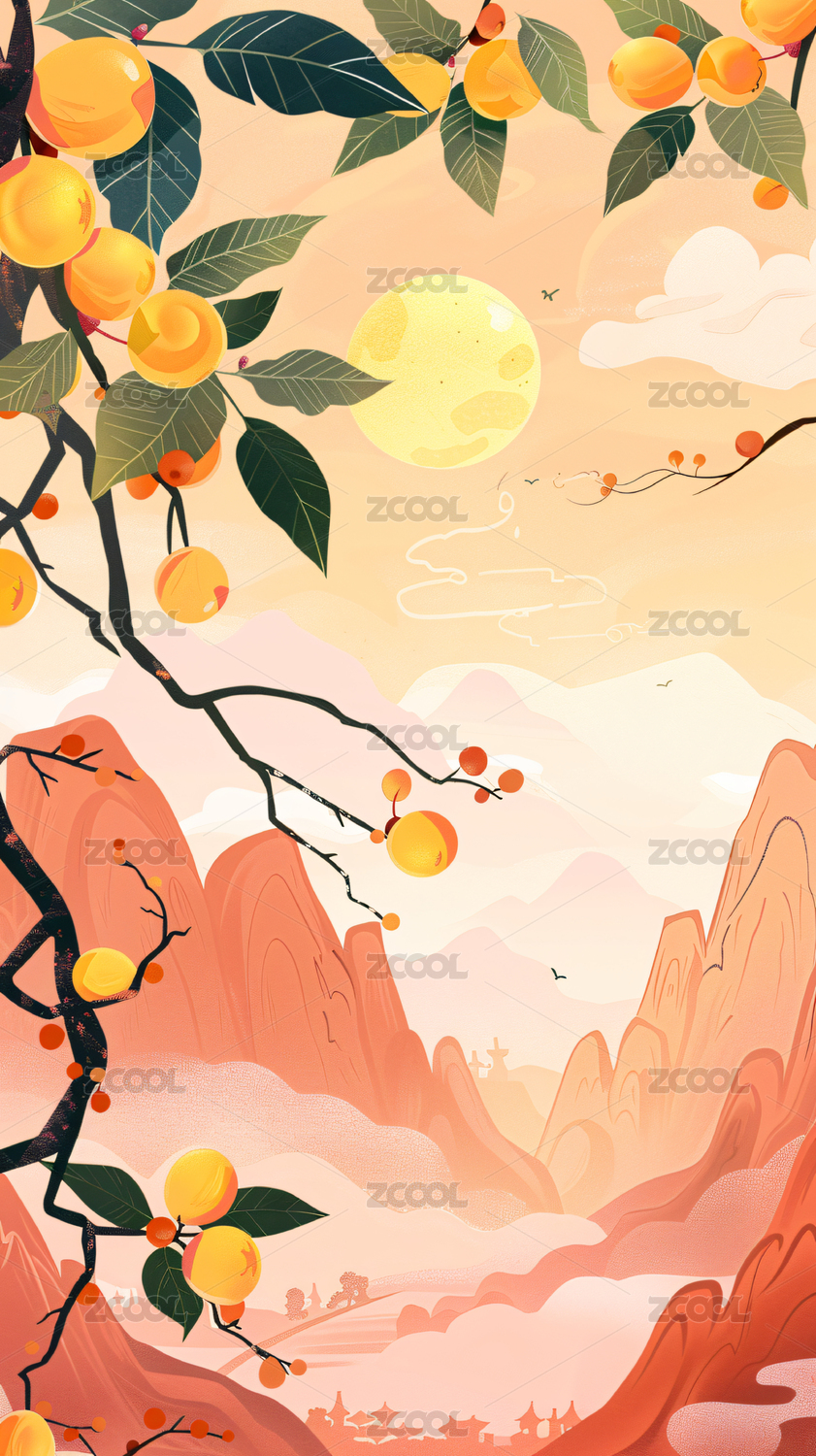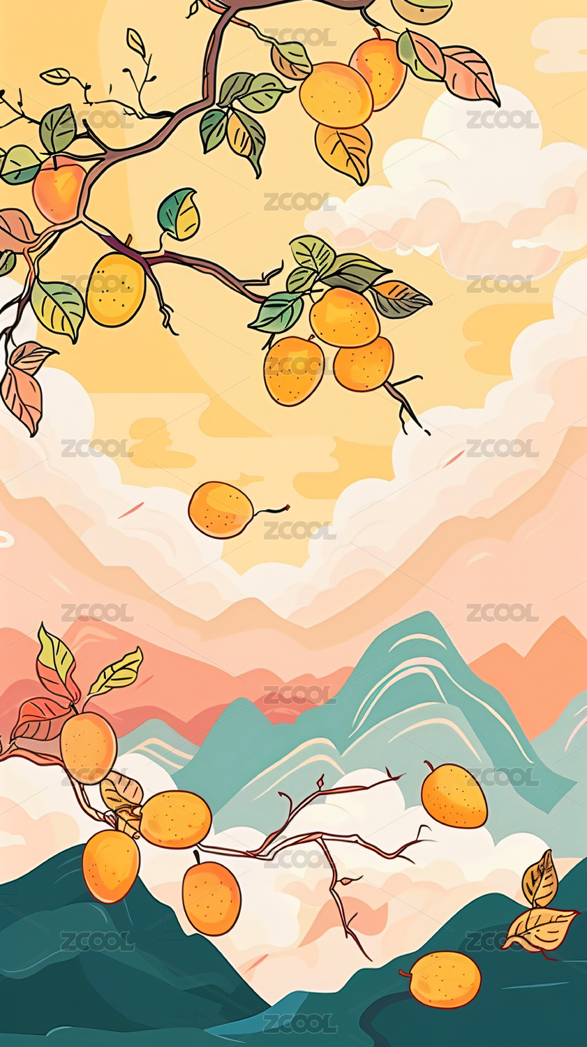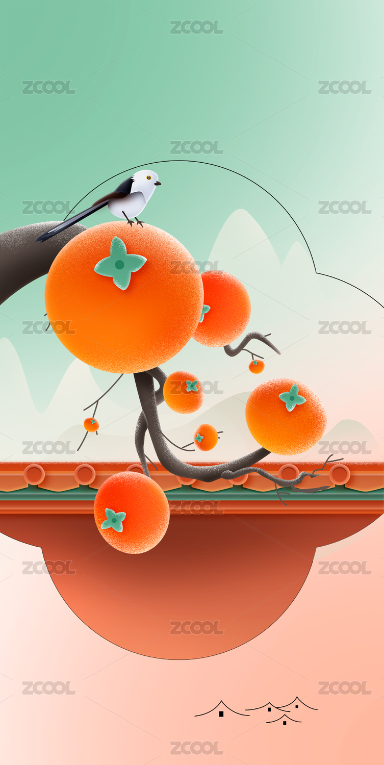 秋天柿子树扁平国风背景插画