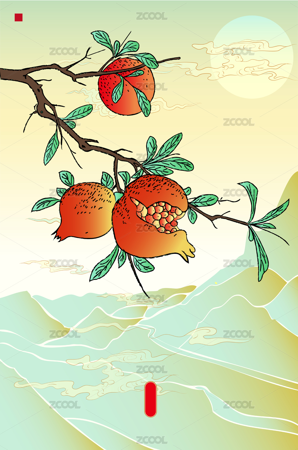 古风石榴树枝工笔矢量中国画插画海报模板