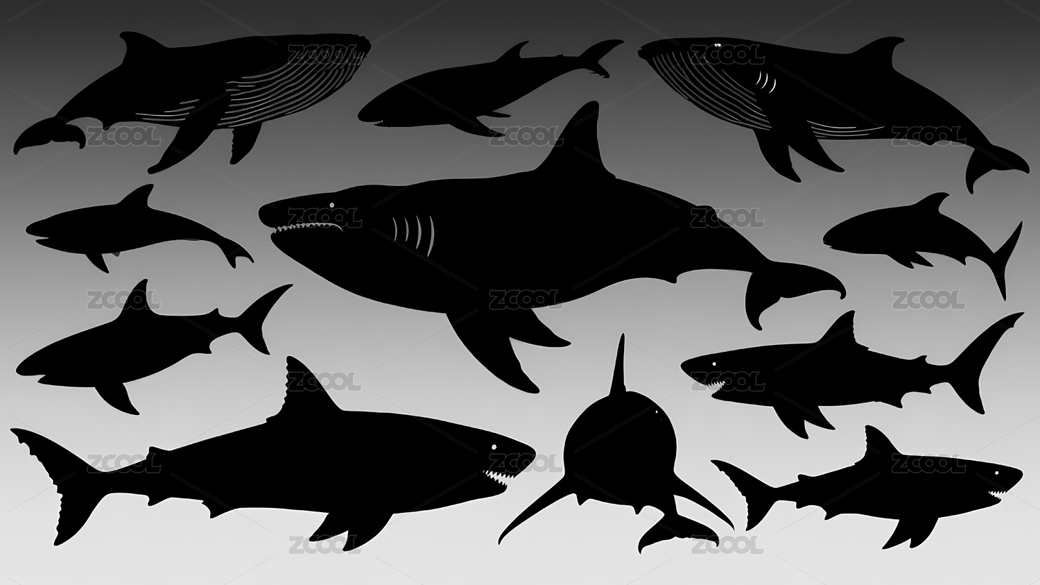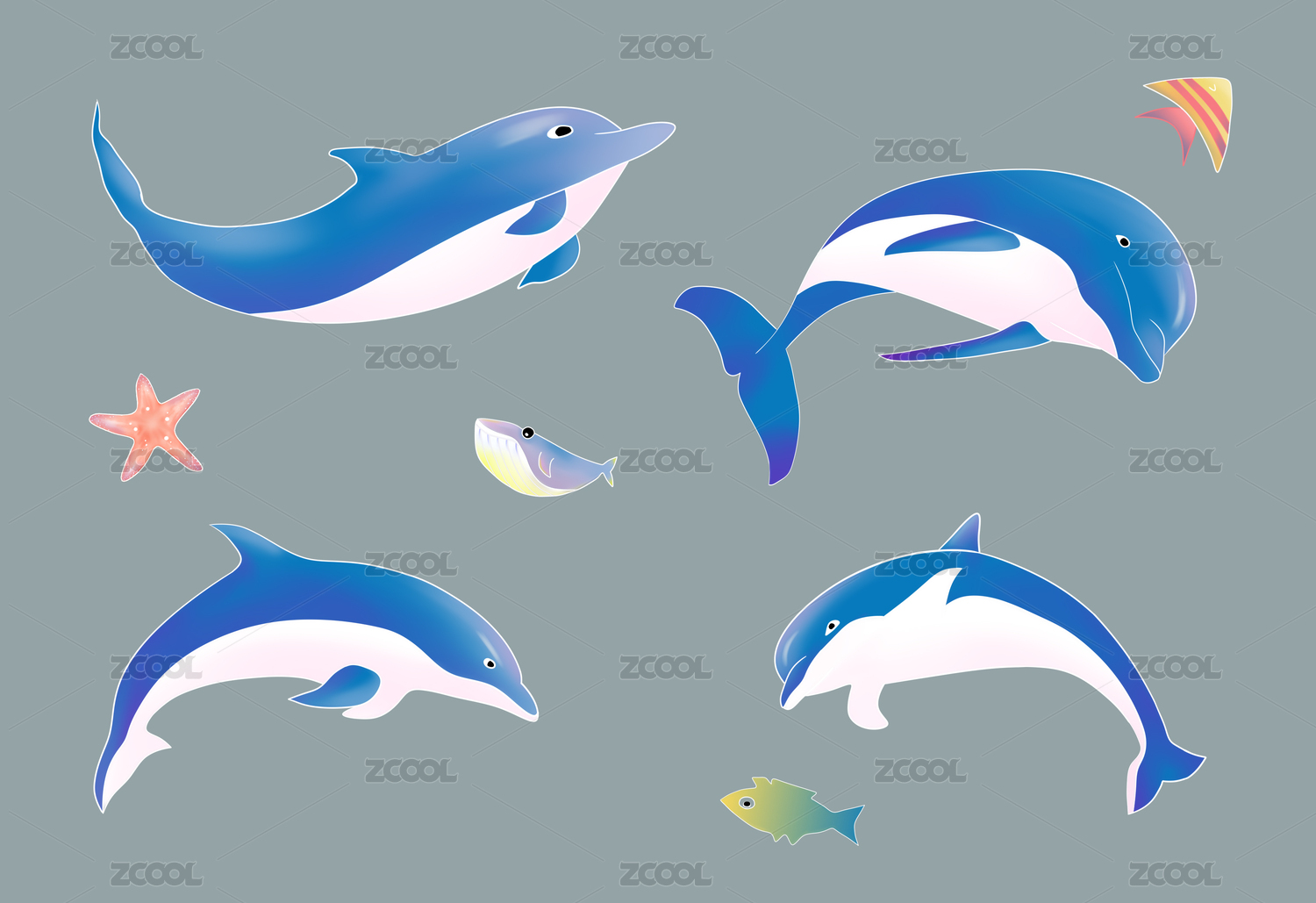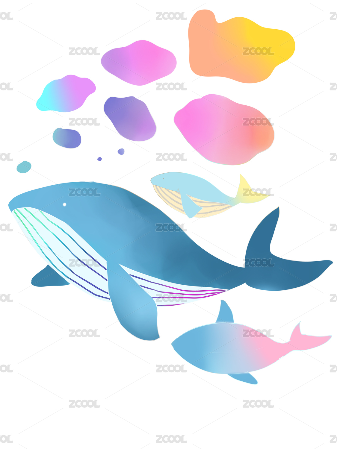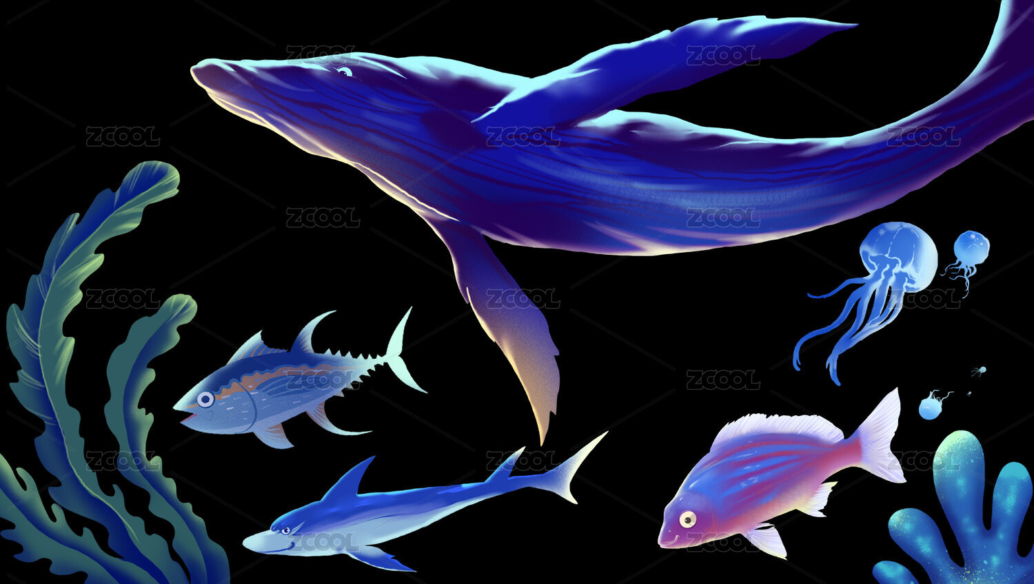 矢量海洋生物插画组合鲸鱼魔鬼鱼水母海豚