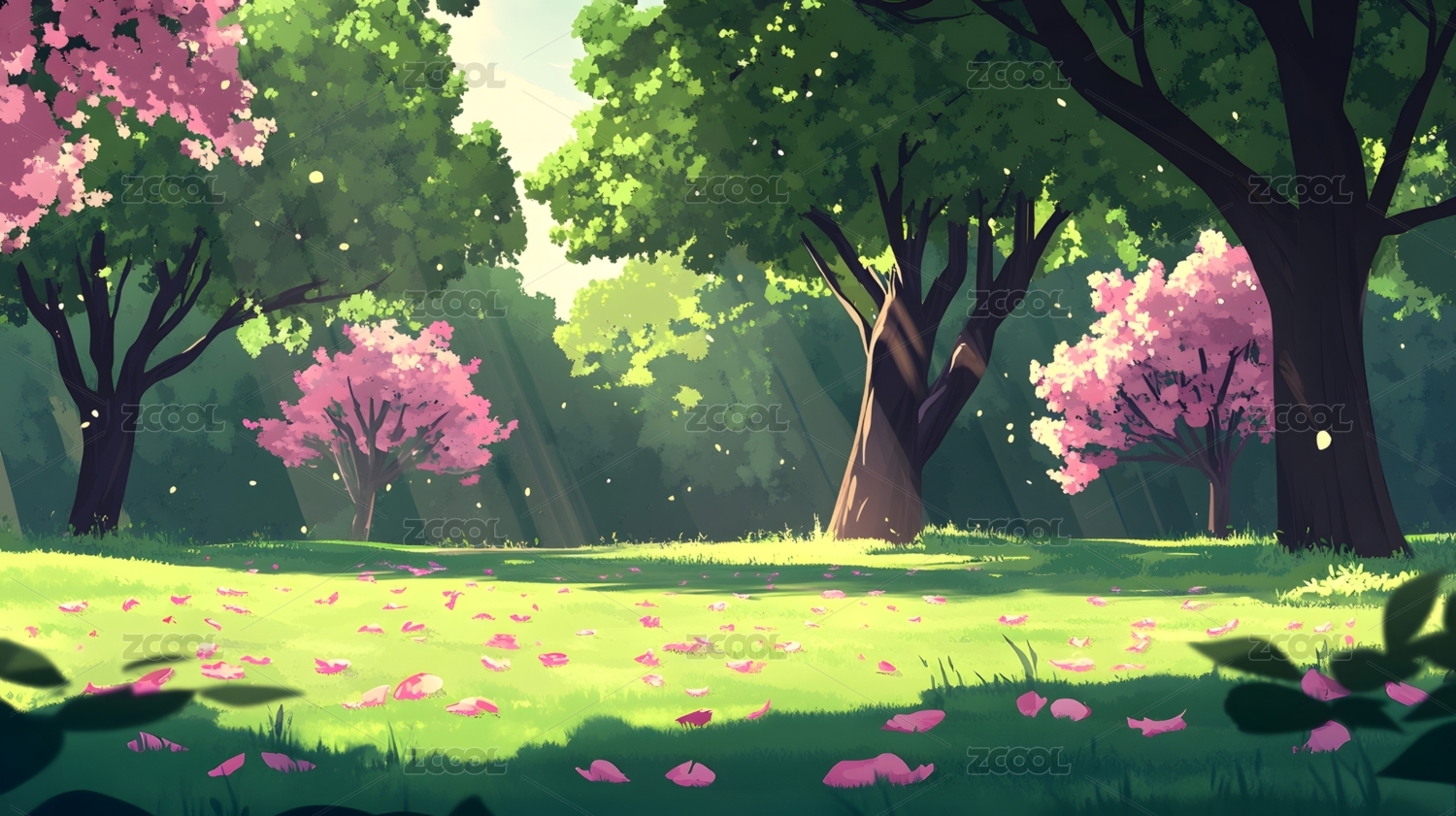春日公园中的新绿树木与斑斓花瓣